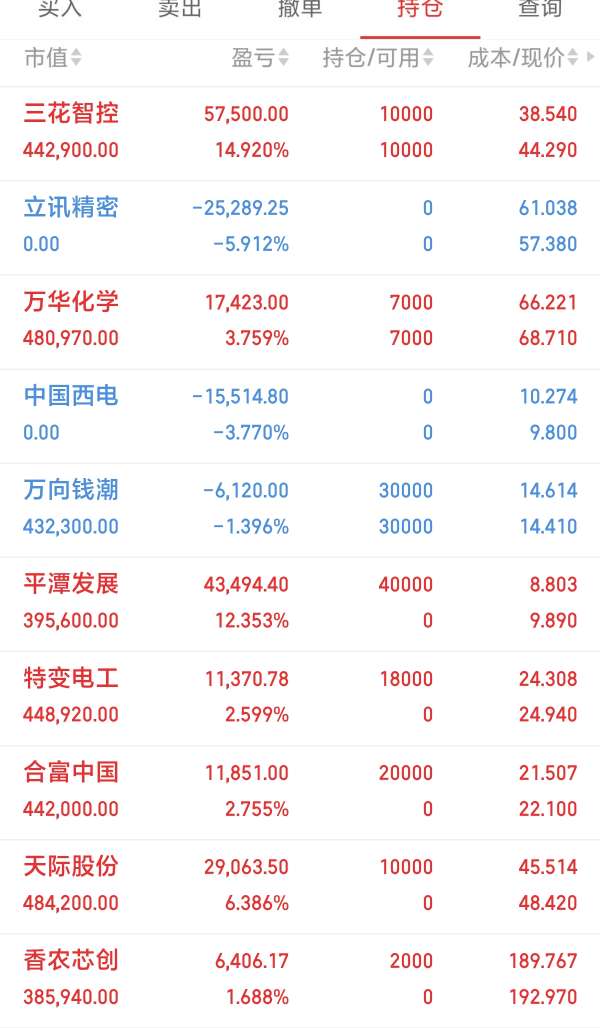 今天市场沙分了,鹏哥也沙分了。市场沙分了先不说,先说说鹏哥吧。起因是上个星期我发了表格给我朋友,里面有中免、海矿、大有、合富、中铝、保变、江天这些,我让他自己选着来,后来我就没管他了,他今早突然打电话给我问什么时候出,我就问他是哪只?他说他全进了,这些天看着框框数前!他居然把这波利润吃满了,鹏哥虽然都进出过这些票,想想才发现都是小肉,鹏哥突然意识到这种不受影响的,敢冒险的勇气才能在这波行情里吃到最大的力意!所以开盘前决定换仓换操作风格了。但是激进就等于冒更大的险,鹏哥自己做好心理准备了,提醒铁子们也一样。