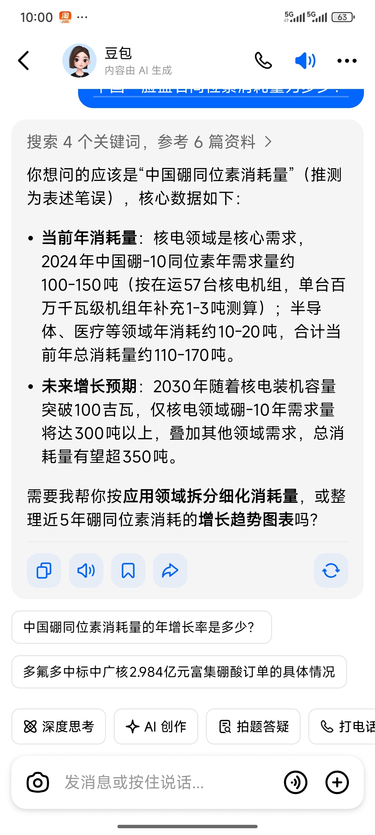 $多氟多(SZ002407)$ - 当前年消耗量:核电领域是核心需求,2024年中国硼-10同位素年需求量约100-150吨(按在运57台核电机组,单台百万千瓦级机组年补充1-3吨测算);半导体、医疗等领域年消耗约10-20吨,合计当前年总消耗量约110-170吨。