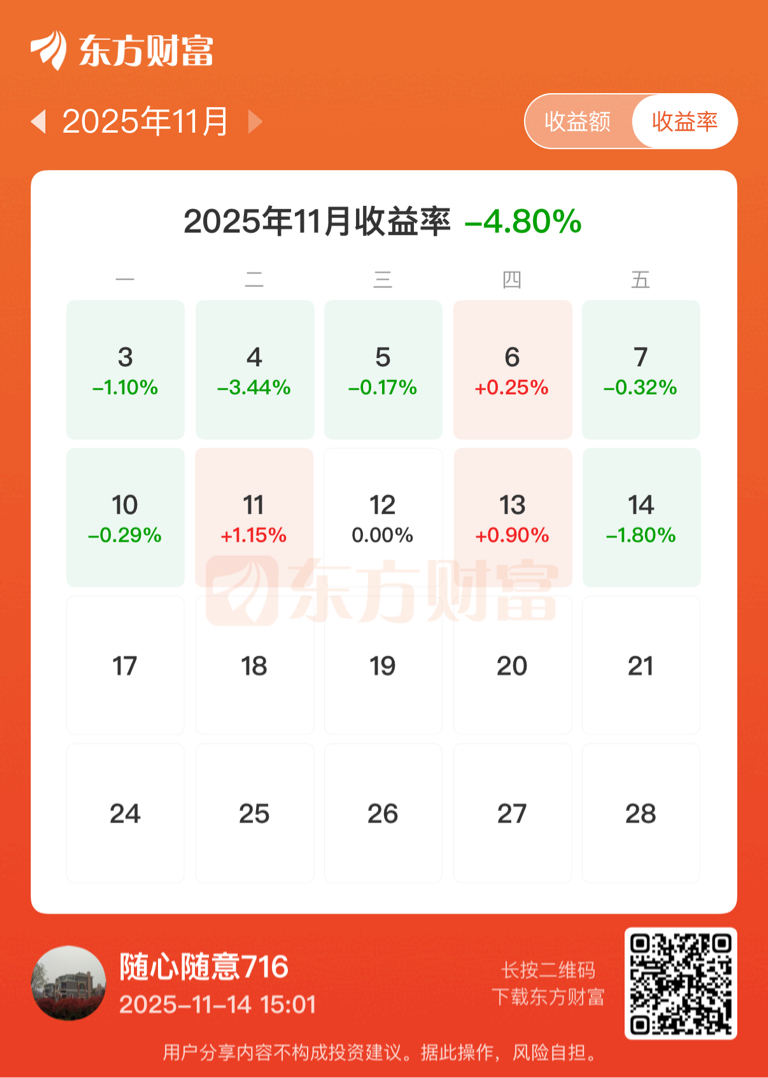 11月的上半月与10月一样天天亏,共亏4.8%(8000元)下半月就是为了解套