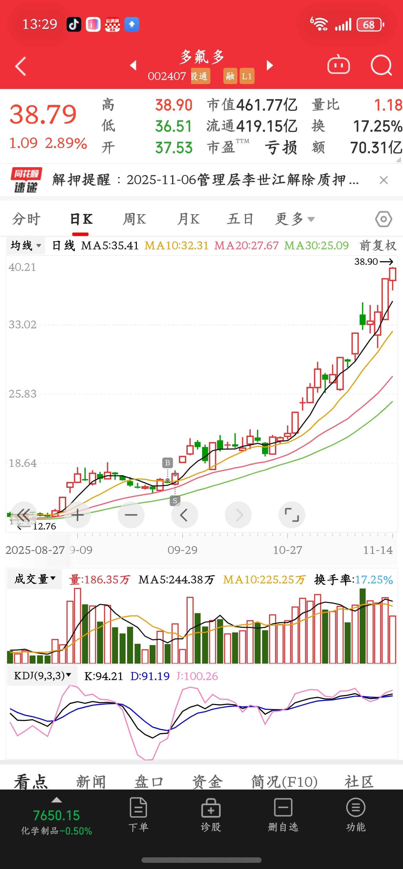 $多氟多(SZ002407)$ 每天看,就是没买回来,转眼间翻倍了。。。恐高。。说不定它还能翻倍。。。不敢进,