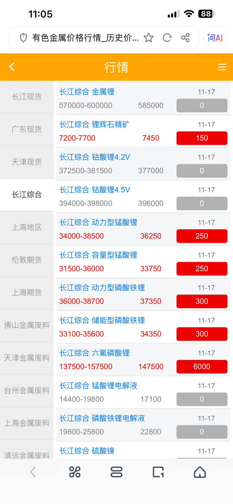 11月17日六氟磷酸锂报价已出,均价较上周五上涨6000,涨幅高达4.24%,最