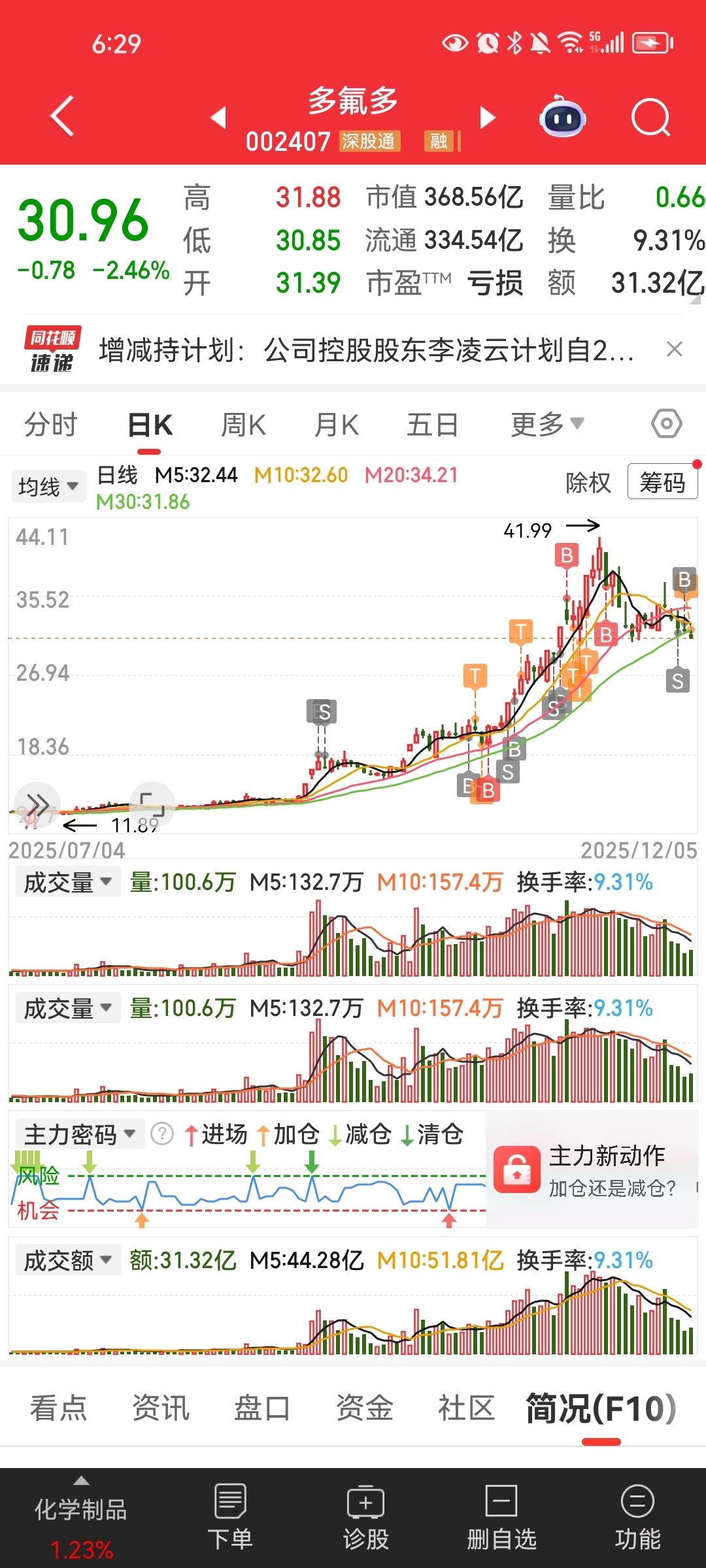 $多氟多(SZ002407)$ 有图为证,暴涨期间始终重仓参与,始终满仓做大T,持股成本已降至∽负10003.97,至昨天收盘持有10手,担心周末出幺蛾子选择了轻仓,果真出了幺蛾子,周一敢开盘大跌,开盘价买1000手,然后大跌大买、小跌小买至收盘满仓,周一要和小李子扛上了,立帖为证…