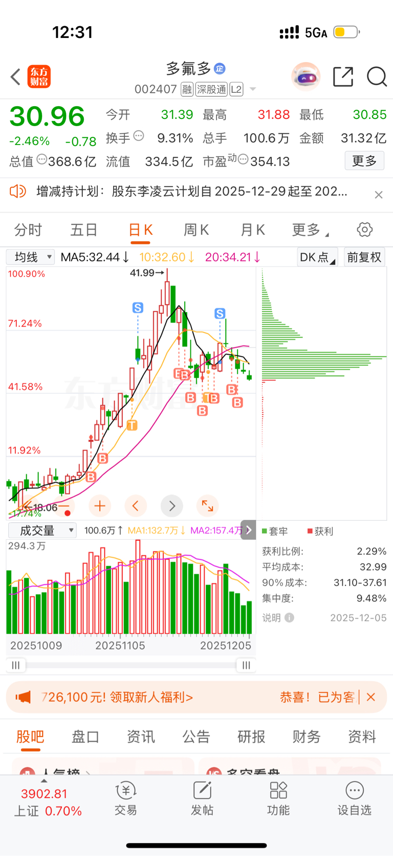 $多氟多(SZ002407)$ 从盈利到40个点补仓到亏损一个点,我觉得这个减持就是虚慌一枪,星期一应该会下杀,但是星期二绝对涨回来 ,这是我的推判,星期一下杀直接把最后的仓位打满,拿长期,用时间来换