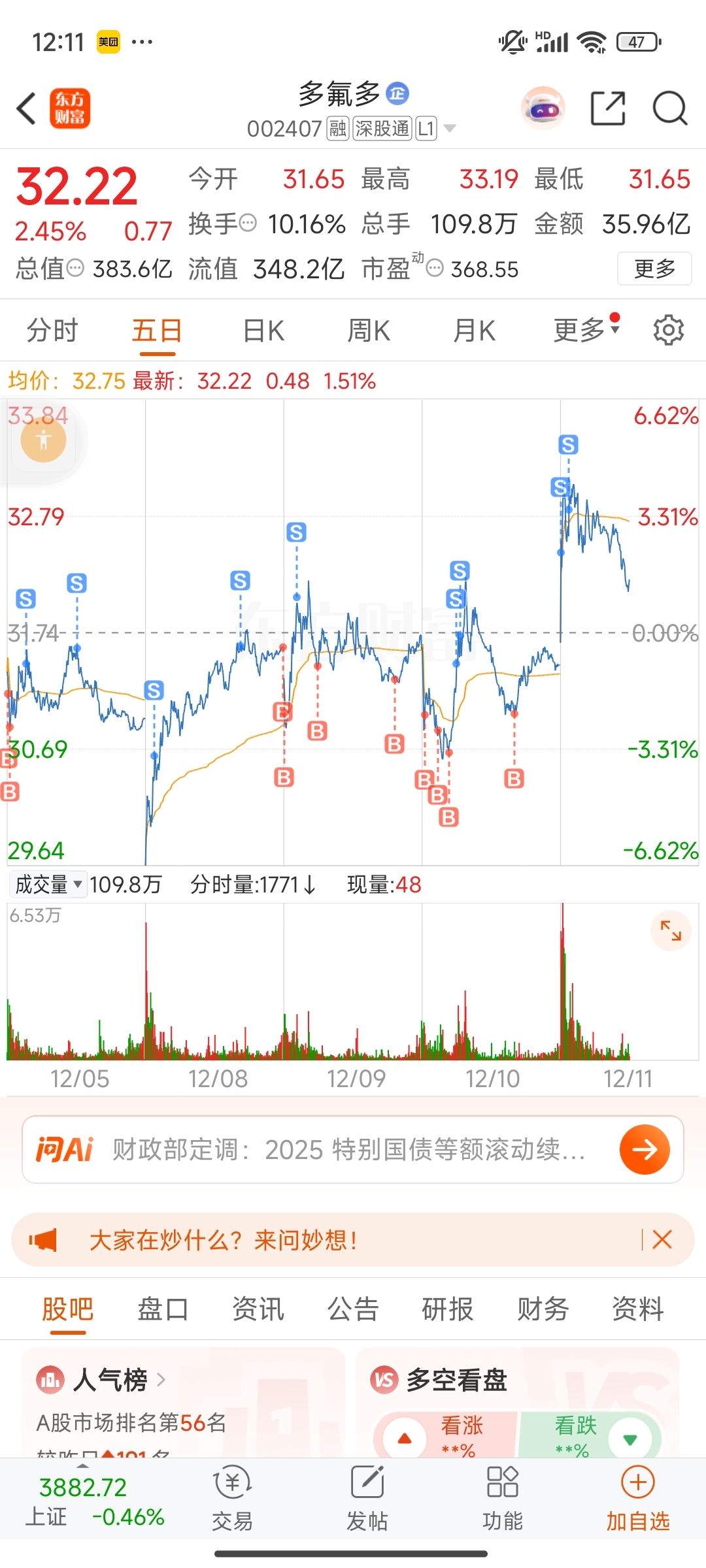 $多氟多(SZ002407)$ 第三次进多氟多,36进来的,做t实现盈利,今天先清了,下跌趋势的股真难做