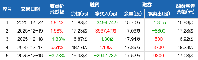 融资方面,当日融资买入2.27亿元,融资偿还2.62亿元,融资净偿还3494.74万元。融券方面,融券卖出1.31万股,融券偿还2.67万股,融券余量15.7万股,融券余额463.94万元。融资融券余额合计16.93亿元。