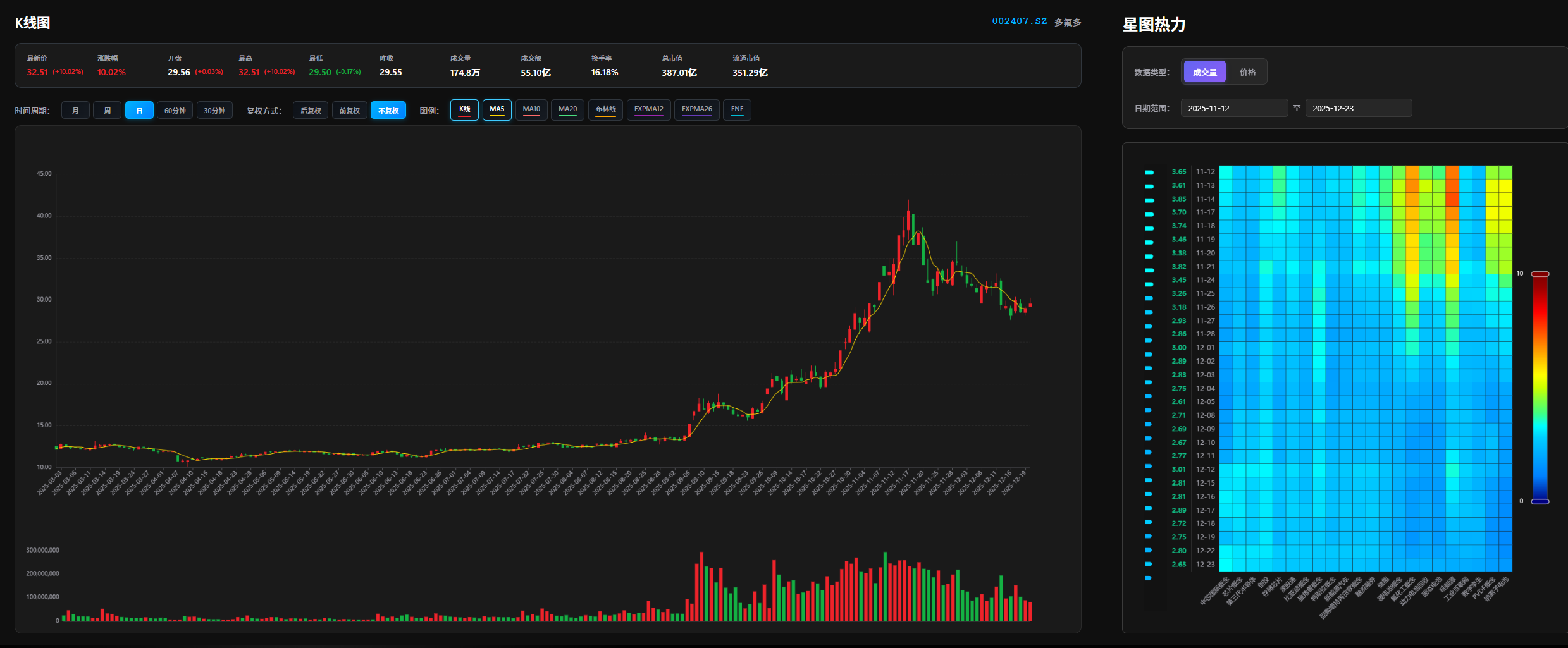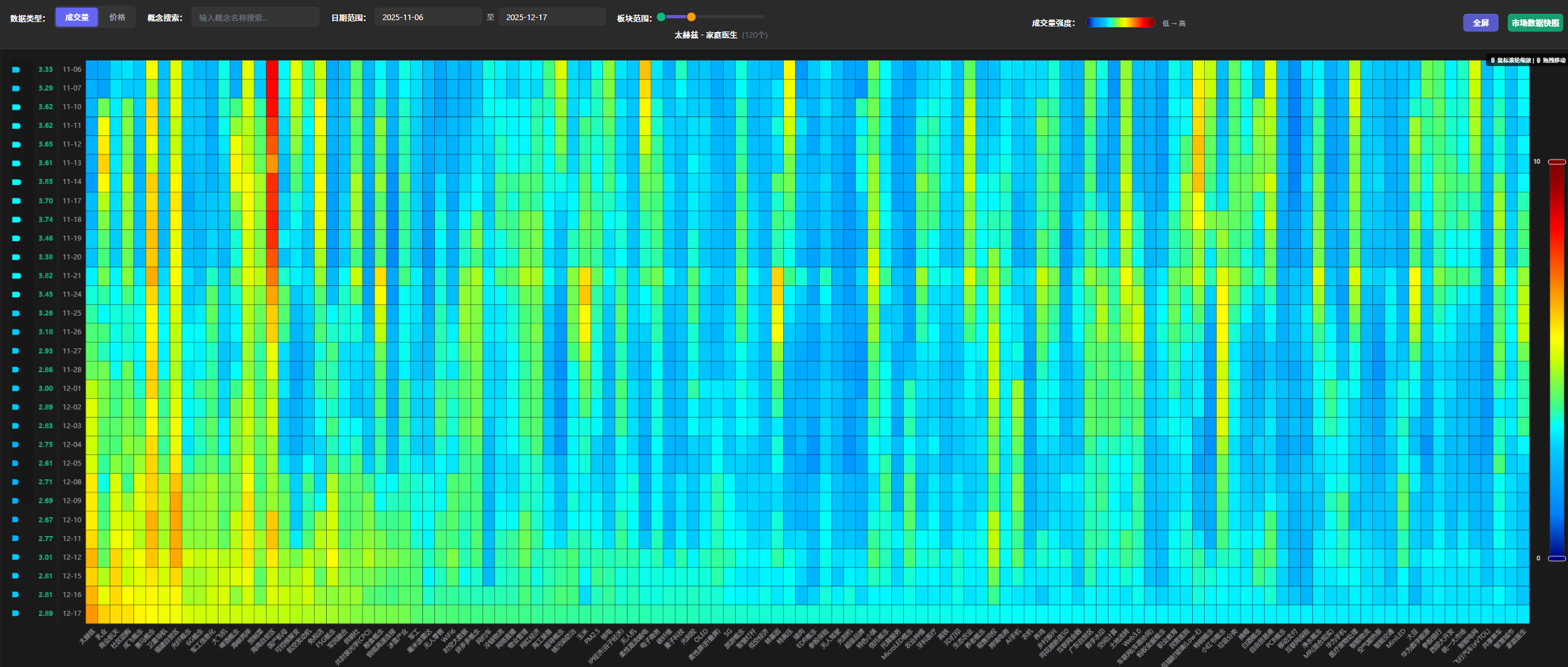 1.热力图左边数值显示大盘在筑底,一直在二点几徘徊。2.第二张个股热力图颜色起来