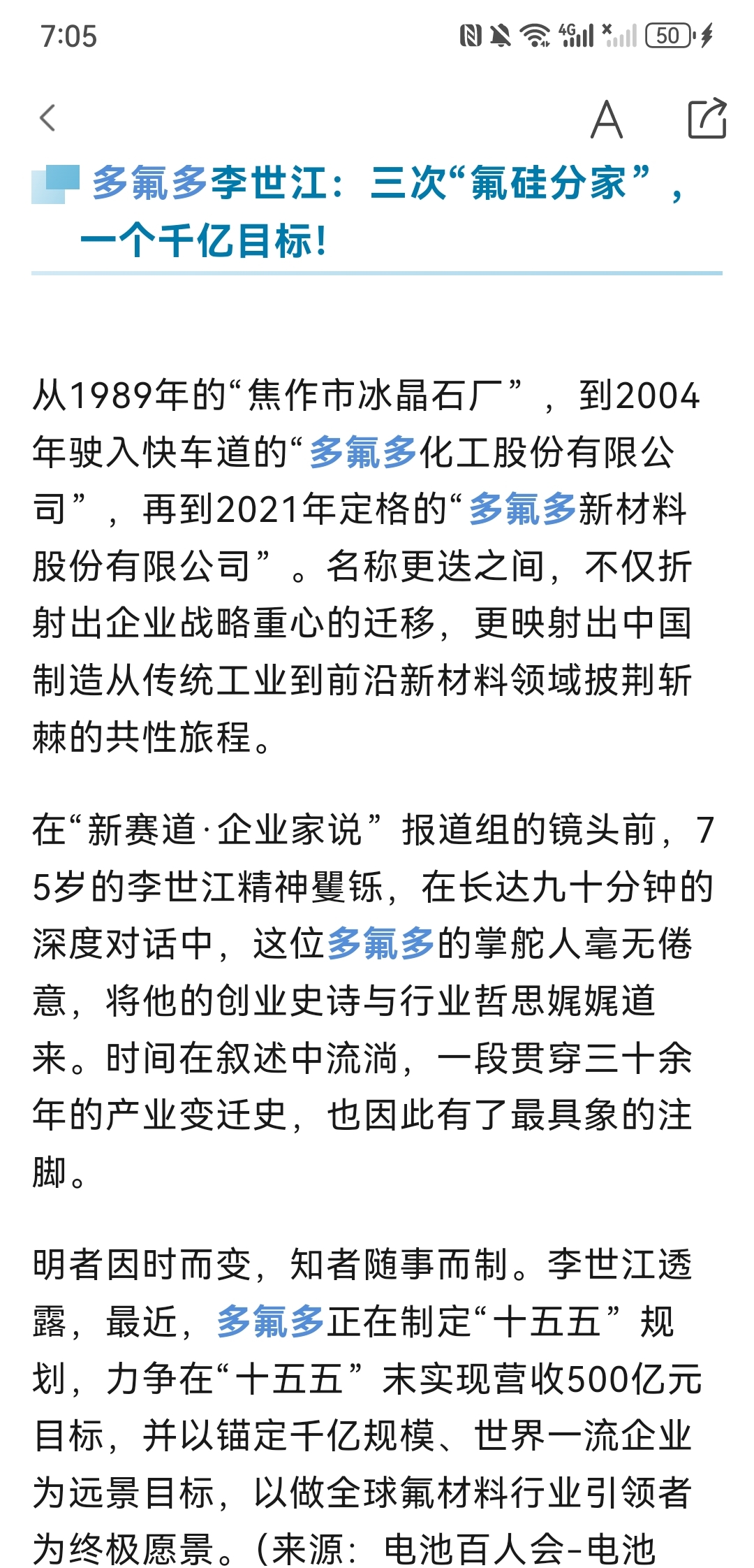 $多氟多(SZ002407)$ 野心大啊,五年内实现营收上500亿,目标1000亿,产值世界第一!