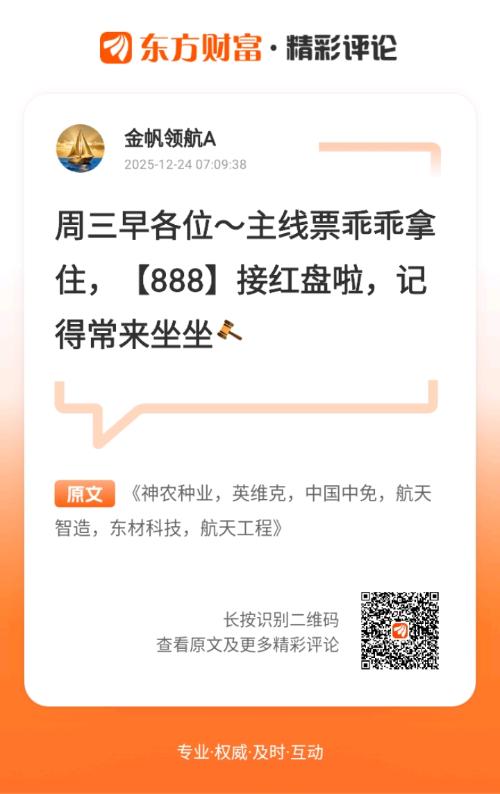 各位钓友早!今天阳光正好,心态也敞亮。 我炒股跟钓鱼一个路子,认准核心水域就沉心等机会。经过上周试钓观察,今天正式敲定跨年主线:满仓商业航天和AI硬件(芯片方向)。买点大概率不舒适,可能要承受回调,但这俩方向是我反复研判最看好的,值得蹲一波大物。说到这,突然想起去年跨年的时候,我因为犹豫没敢重仓主线,结果看着别人的“鱼获”羡慕到拍大腿。那会儿也是纠结了好几天,一会儿想追这个热点,一会儿想守那个冷门,跟钓鱼时频繁换钓位一样,最后啥也没捞着。吃一堑长一智,这次我果断定调,仓位分配也想好了:芯片方向占六层,毕竟AI硬件是当前的“黄金鱼层”,确定性更高;商业航天占四层,算是布局一个有爆发力的“潜力鱼坑”,双管齐下更稳妥。