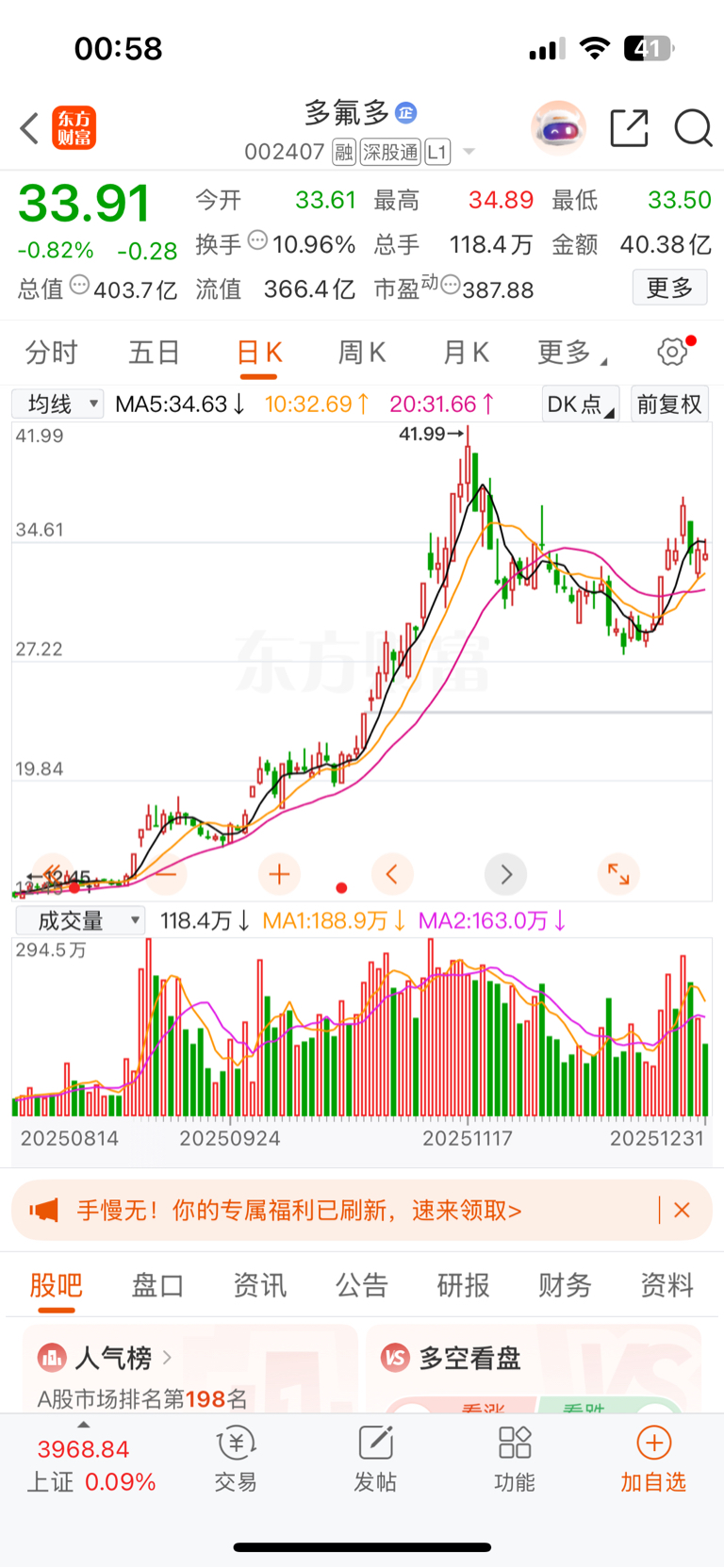 $多氟多(SZ002407)$ 明天又开盘了哈,简单复了盘,并理性制定了新年交易计划,多氟多站不稳34.55元以上,积极减半仓,如若跌破32.50元,清仓出局观望。