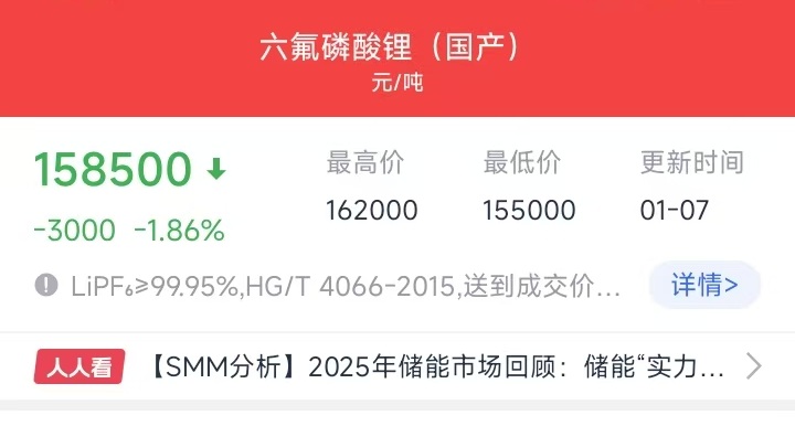 六氟磷酸锂再次大跌,处于持续下跌状态