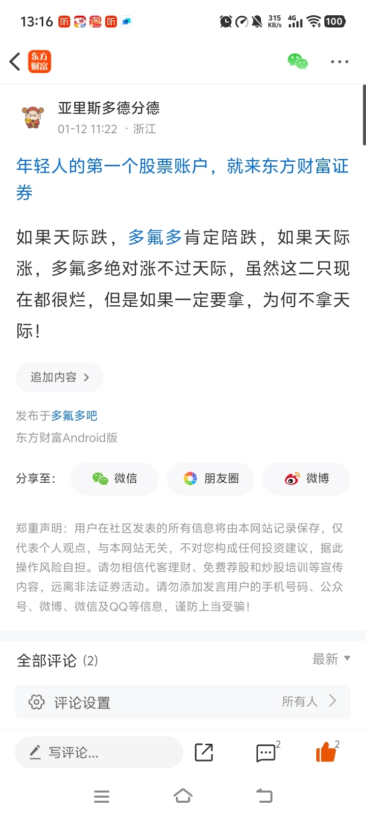 温馨提示: 1.根据《证券法》规定,禁止编造、传播虚假信息或者误导性信息,扰乱证券市场;2.用户在本社区发表的所有资料、言论等仅代表个人观点,与本网站立场无关,不对您构成任何投资建议。用户应基于自己的独立判断,自行决定证券投资并承担相应风险。《东方财富社区管理规定》