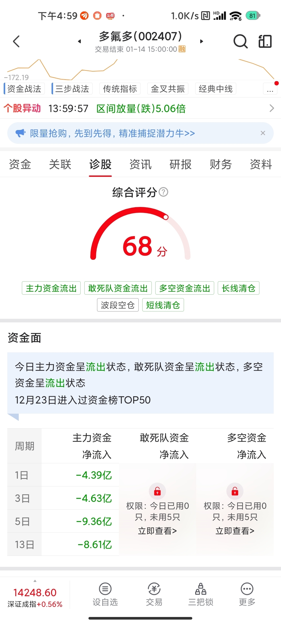 $多氟多(SZ002407)$ 明天还能跌多少谁也不知道,但是刚才查看了一下主力13天时间跑了8.6个亿。这个企业自己都不看好自己的公司了,清仓式卖出,间接式连着跌了7天了。