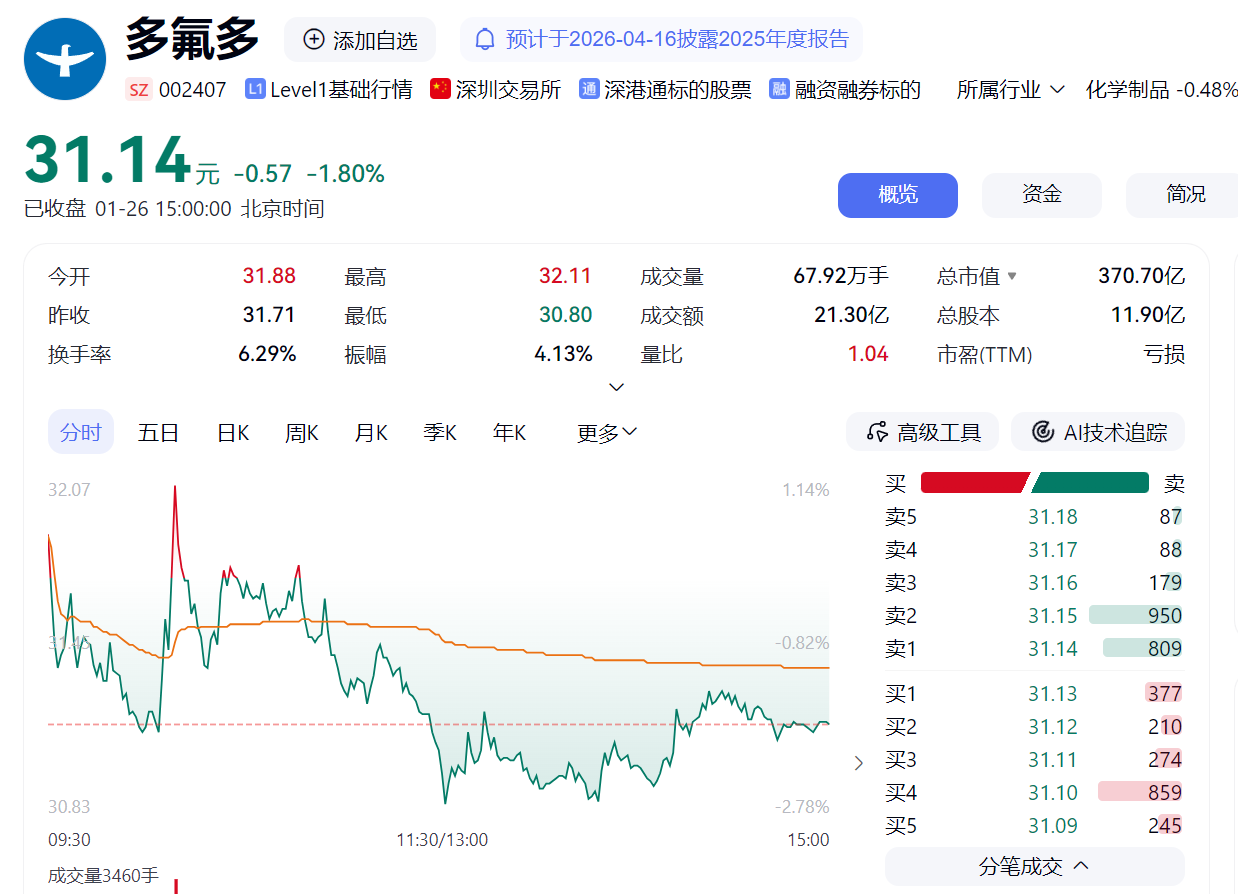 股价方面,截至1月26日收盘,多氟多报收31.14元/股,当日跌幅1.8%,公司总市值370.7亿元。
