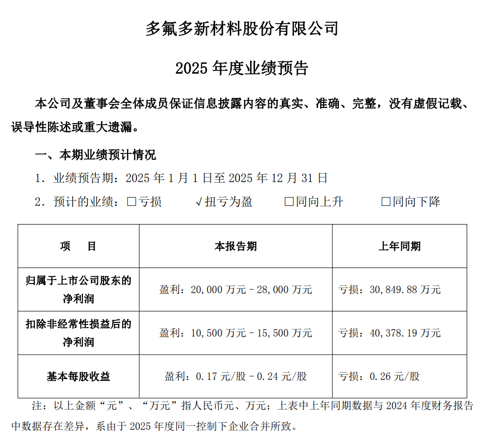1月26日晚间,多氟多(002407.SZ)披露2025年度业绩预告,公司预计2025年度归属于上市公司股东的净利润为2.00亿元至2.80亿元,而上一年度同期,公司归母净利润为亏损3.08亿元,实现从亏损到盈利的关键性反转,成为本次业绩预告核心看点。