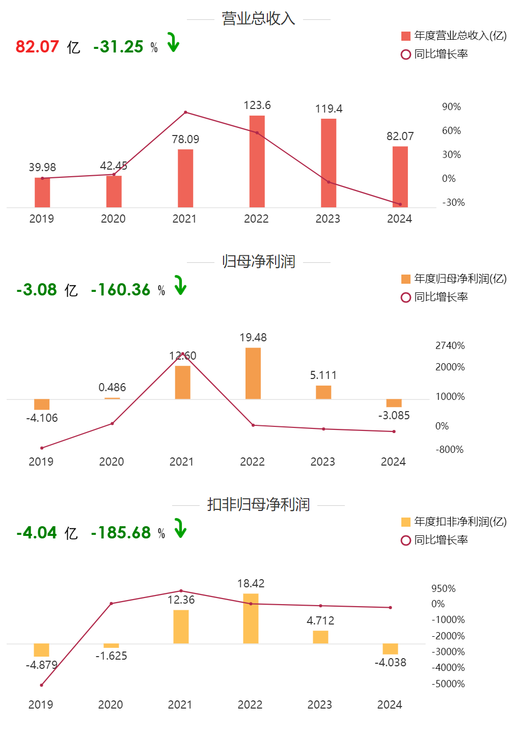 公开财报数据显示,2024年度,公司实现营业收入82.07亿元,同比下降31.25%;归母净利润-3.08亿元,同比下降160.36%;扣非净利润-4.04亿元,同比下降185.68%。