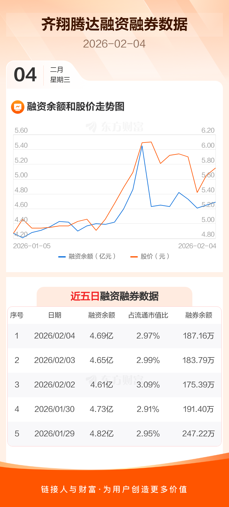 交易所最新数据显示,齐翔腾达于2026年2月4日获融资买入2150.17万元,融资偿还1743.80万元,当日融资净买入406.37万元。目前,该股融资余额4.69亿,占流通市值比例为2.97%。
