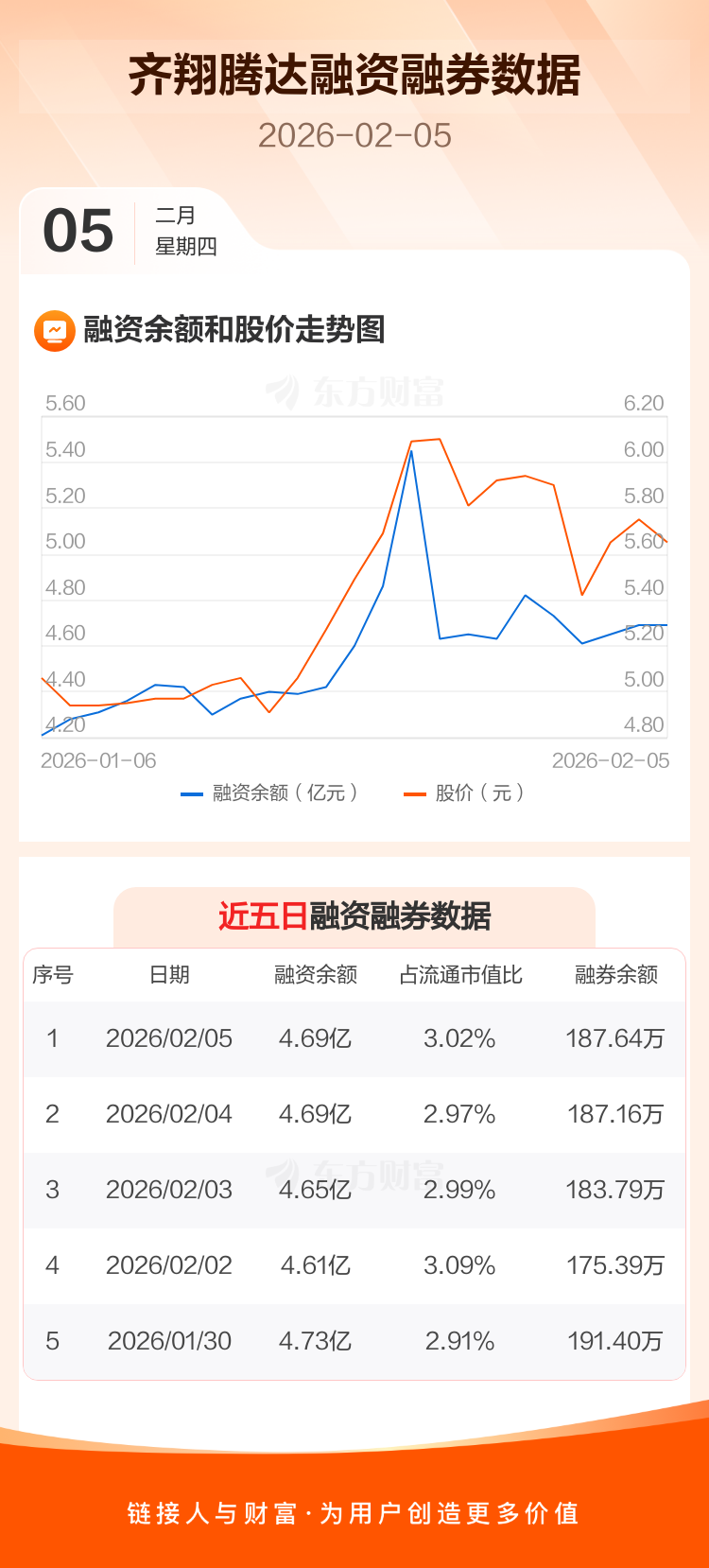 交易所最新数据显示,齐翔腾达于2026年2月5日获融资买入1884.03万元,融资偿还1916.71万元,当日融资净偿还32.67万元。目前,该股融资余额4.69亿,占流通市值比例为3.02%。