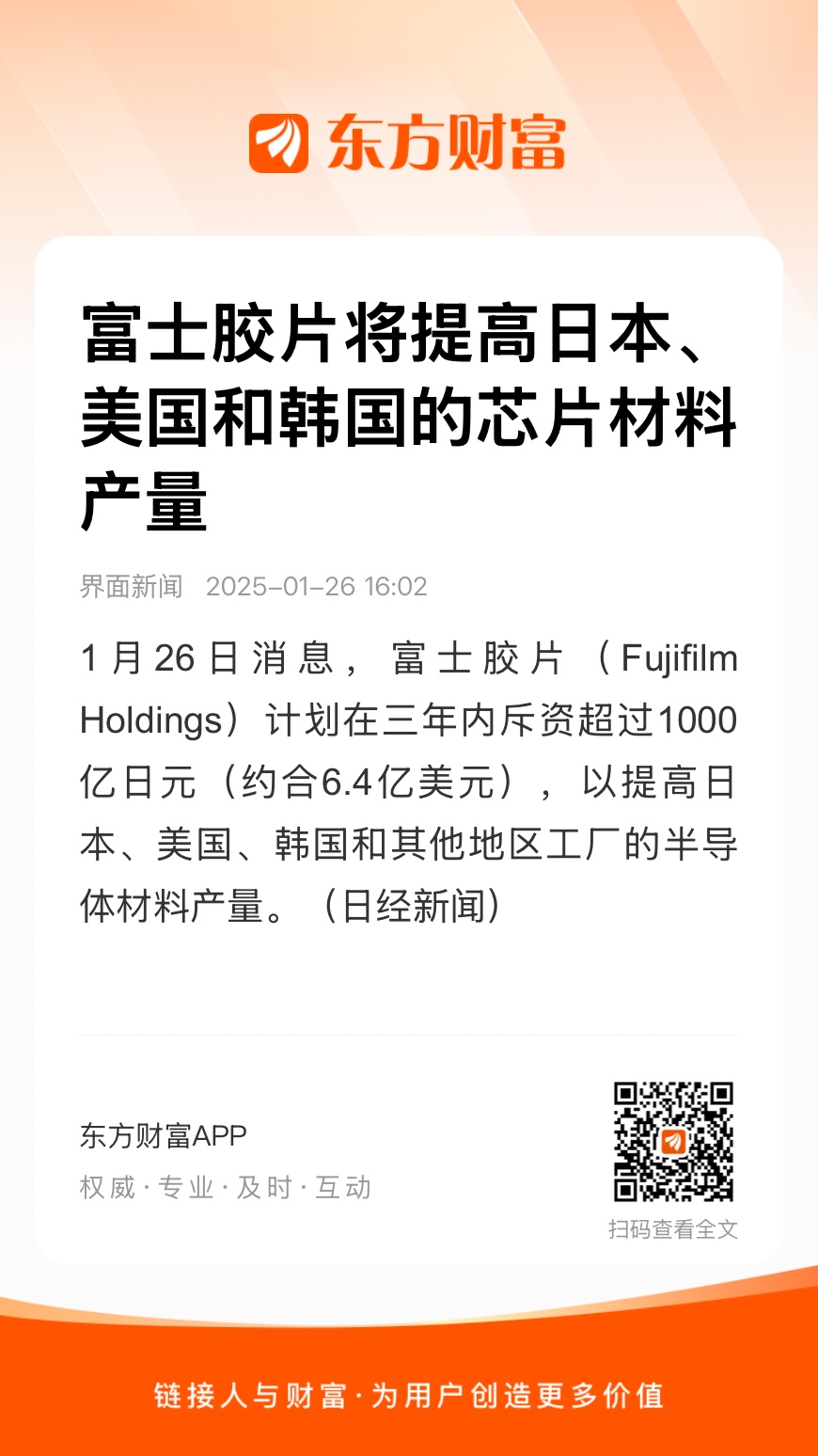 1月26日消息,富士胶片(Fujifilm Holdings)计划在三年内斥资超过1000亿日元(约合6.4亿美元),以提高日本、美国、韩国和其他地区工厂的半导体材料产量。(日经新闻)