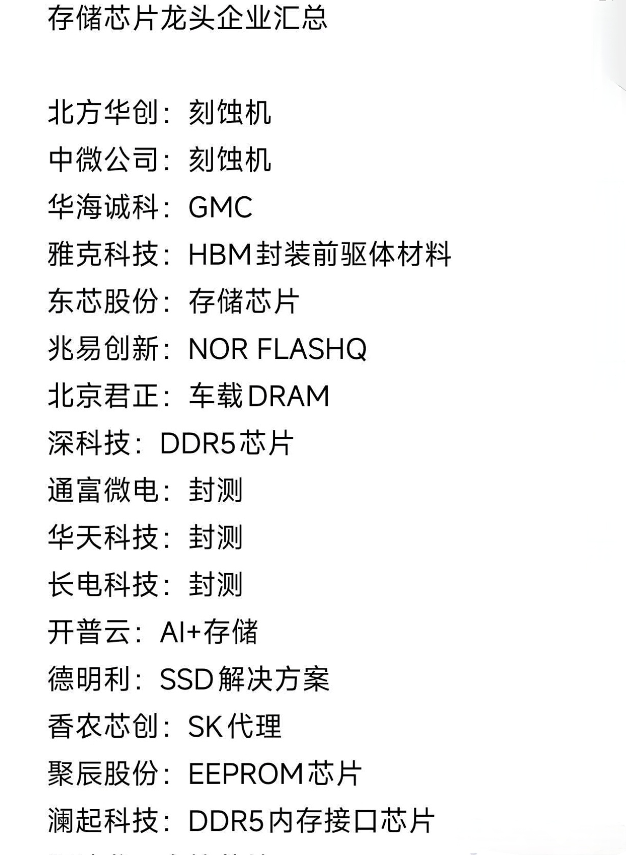 昨晚,数据中心崩溃。管理员咒骂着重启服务器。罪魁祸首?存储瓶颈。全球芯片短缺,手机发货延期。消费者排队,脸红脖子粗。为什么这些企业重要?看行为。北方华创的工程师,加班到凌晨。咖啡杯边,方案纸crumpled。不是英雄主义,是deadline。竞争中,中微公司推新机型,市场份额争抢。华海诚科的 GMC,在高温车间,机器嗡嗡响。雅克科技的材料,薄如蝉翼,HBM 封装让 运算飞速。东芯股份的存储芯片,堆在仓库。库存警报红灯闪,需求暴增。兆易创新的 NOR FLASH,嵌入无人机,飞行中数据不丢。北京君正的车载 DRAM,汽车加速时,处理传感器信息。深科技的 DDR5,服务器里热量上升,风扇转得飞快。封测企业,通富微电的工人,戴手套焊接,汗水滴落电路板。华天科技、长电科技的测试台,机器抖动,找出缺陷。开普云的 算法,预测存储需求,节省成本。德明利 SSD 方案,用户升级硬盘,速度提升。香农芯创代理 SK,供应链中断时,备货成了救命稻草。聚辰股份的 EEPROM,工业设备里,参数一改再改。澜起科技的接口芯片,内存卡槽插拔,信号稳定。江波龙的自控芯片,监控温度,防止过热。佰维存储的模块,集成封测,工厂效率翻倍。
