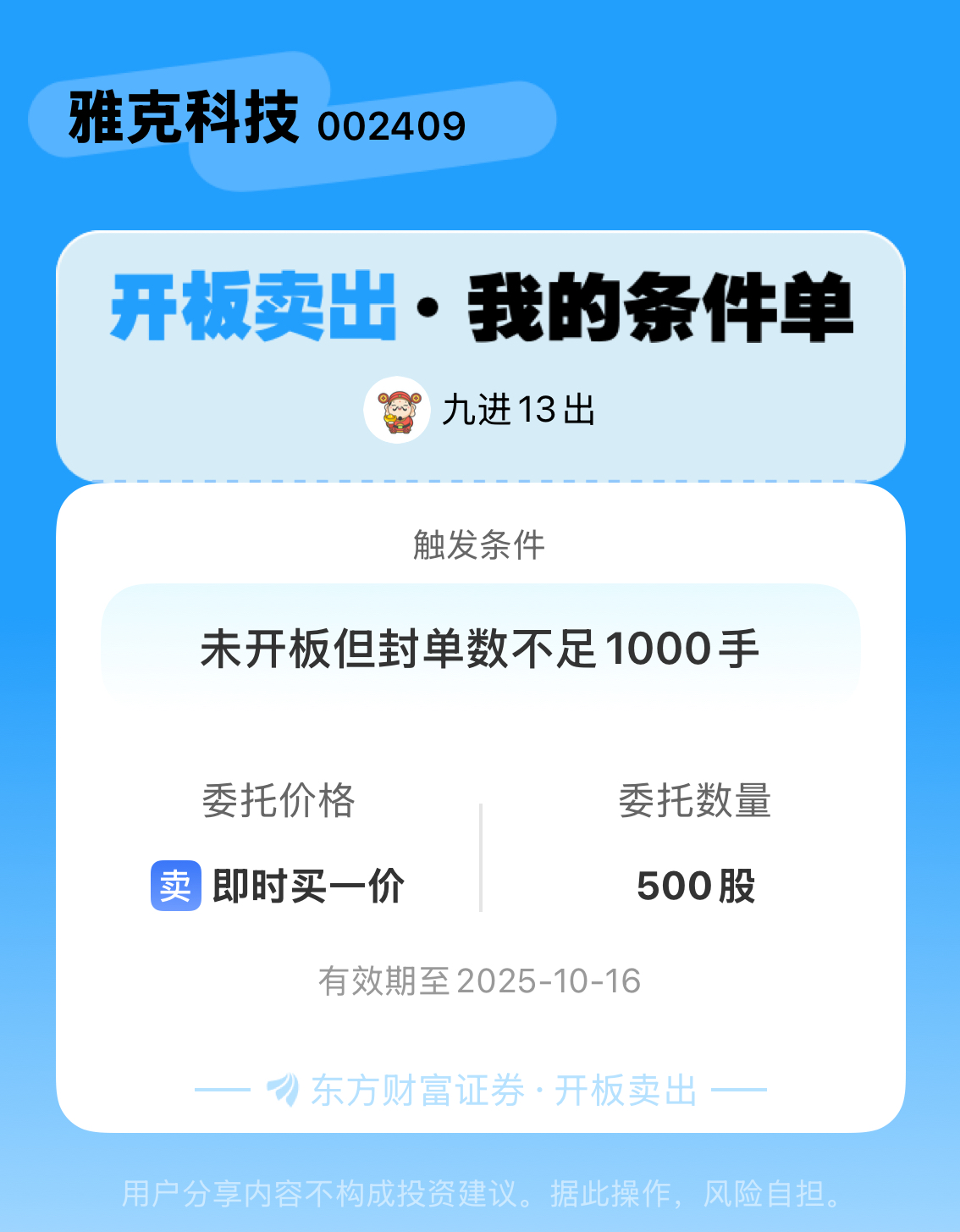 #条件单交流# #开板卖出晒单# 一位股神设置了一个开板卖出条件单,接下来就是见证奇迹的时刻~$雅克科技(SZ002409)$