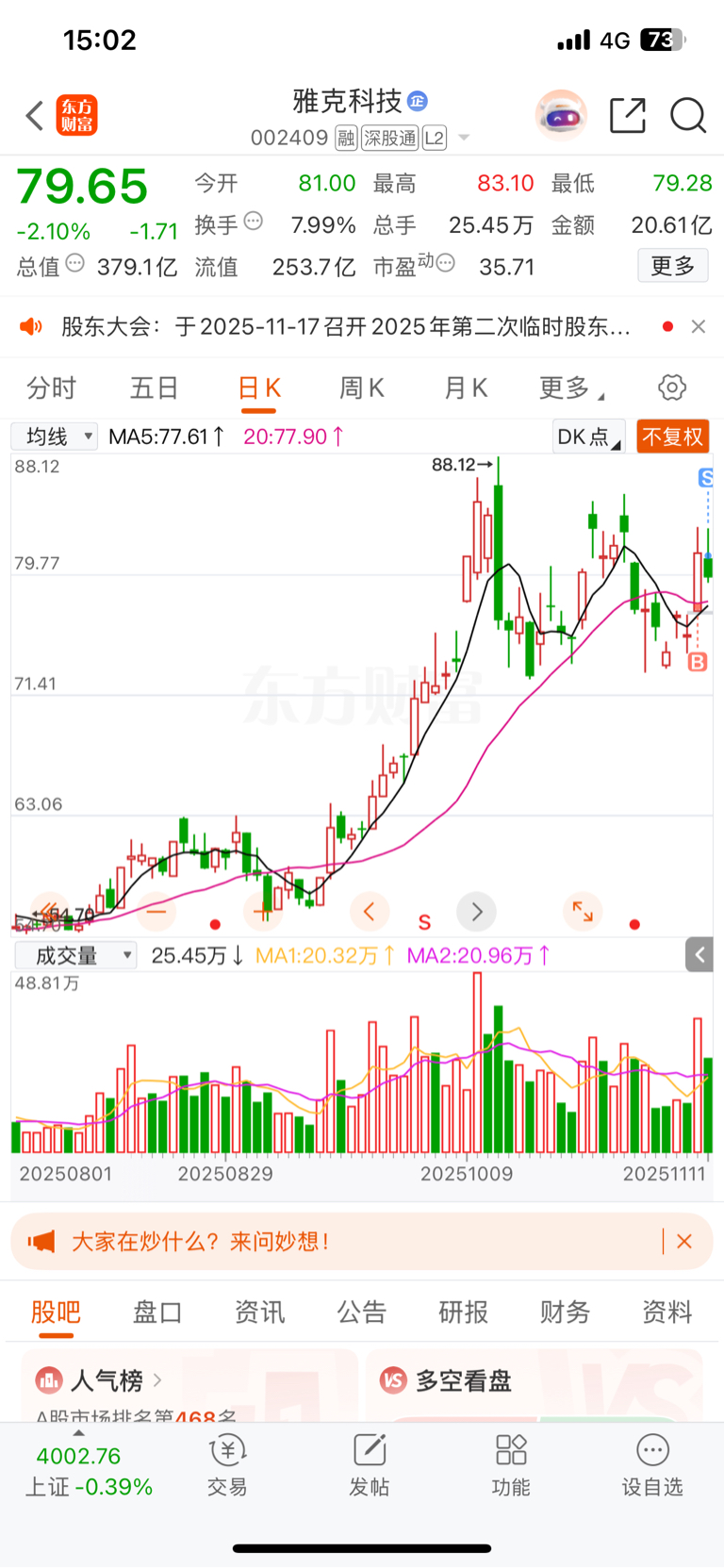 $雅克科技(SZ002409)$ 走了……