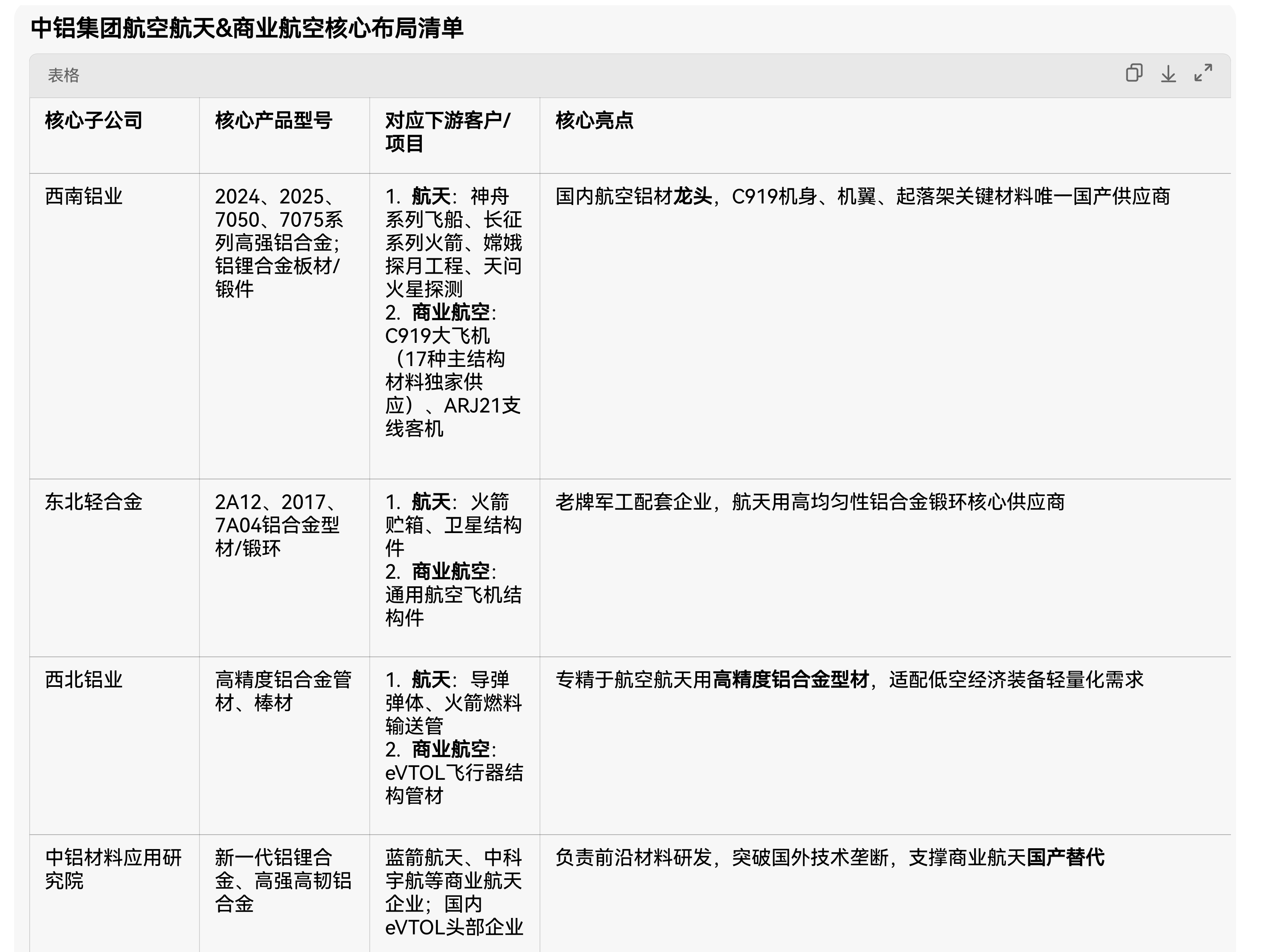 1. 国家战略硬支撑:神舟、长征、C919等国之重器核心铝材独家/主力供应商,17种C919主结构材料打破国外垄断,政策红利持续兑现。