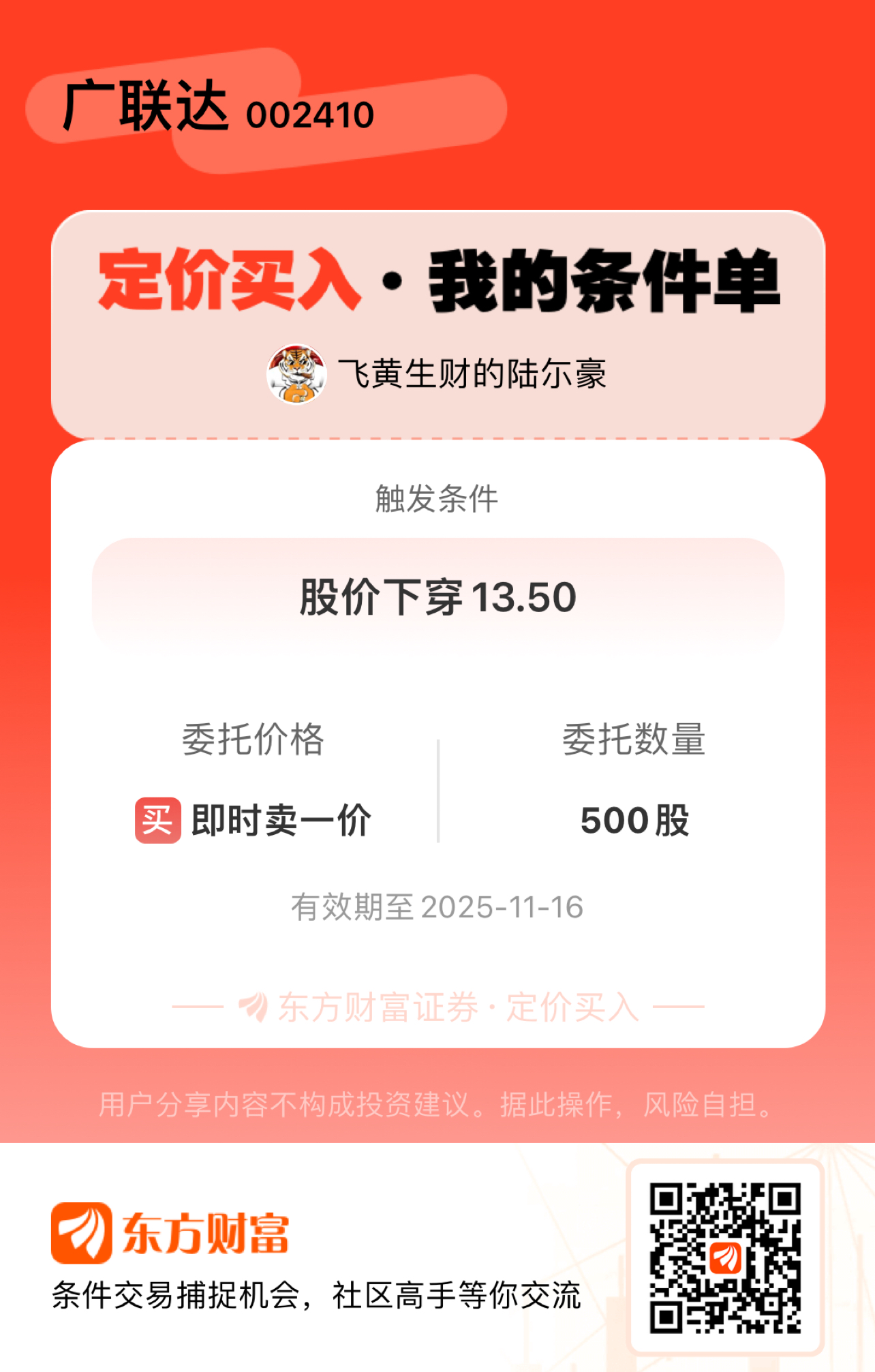 #条件单交流# #定价买入晒单# 一位股神设置了一个定价买入条件单,接下来就是见证奇迹的时刻~$广联达(SZ002410)$