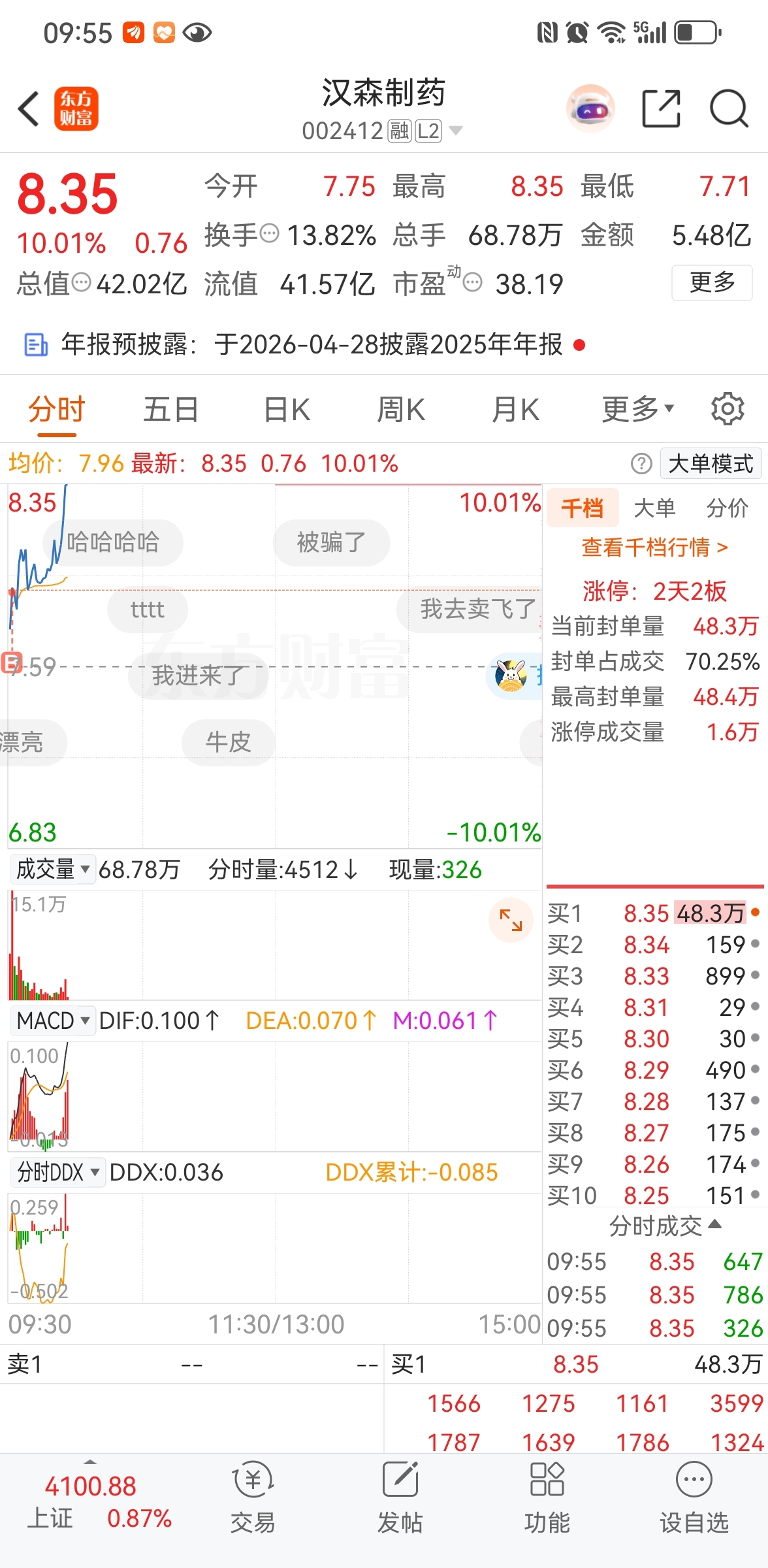 $汉森制药(SZ002412)$ 刚进来,就吃涨停