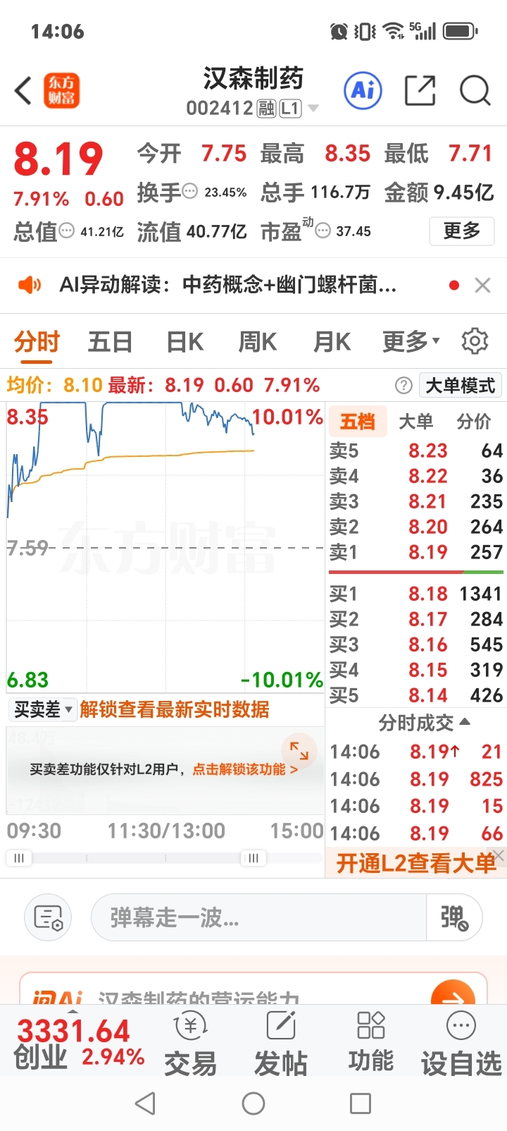 $汉森制药(SZ002412)$ 可怜的散户朋友们,不配合主力资金拉升,这样的割肉卖出的去,是想在低位跑出来到高价股和亏损股里找套吗?该股业绩好市盈率也不高,题材正当时,这样的情况下,就应该坚定信心持股,耐心逢低吸纳地位筹码,而不是这样的杀跌割肉卖出的打破涨停板。这样的杀跌割肉卖出的有什么好处?