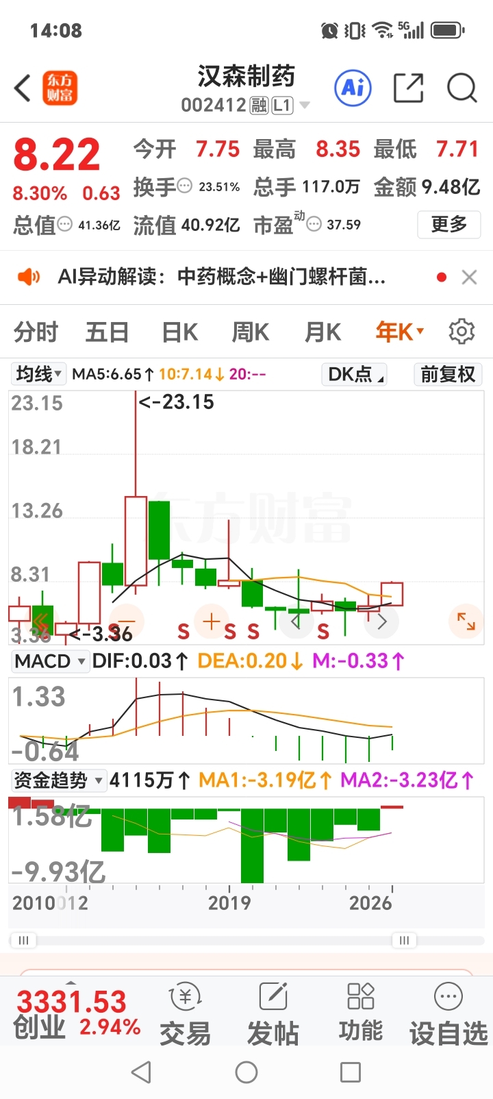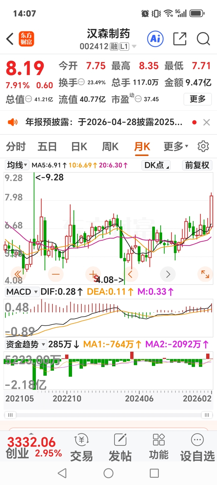 $凯龙高科(SZ300912)$ 这股的主力太厉害啊,每股业绩亏损二毛多钱, 股价还连续拉升四个20%的涨停板,太刺激了啊,太彪悍了啊, 而汉森制药业绩那么好,股价和市盈率那么低,只拉了一个涨停板,第二个涨停板就被打破了,收盘价才8.02元,太不可思议了啊,不知道汉森制药的主力是怎么想的,就那么向熊猫可怜吗?无能为力吗?胆小懦弱的吗?