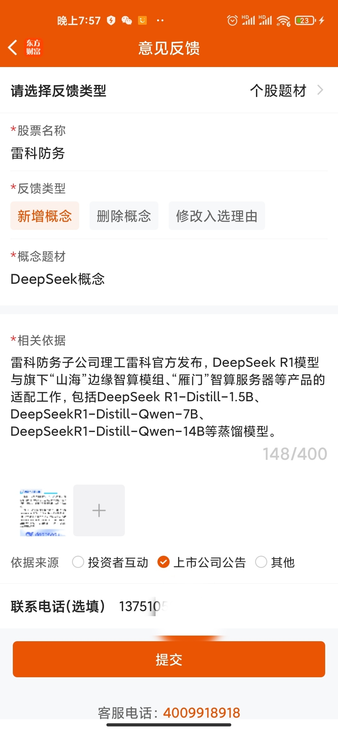 我已在东方财富添加雷科防务为DeepSeek概念,不知道能否通过!大家可以参考我
