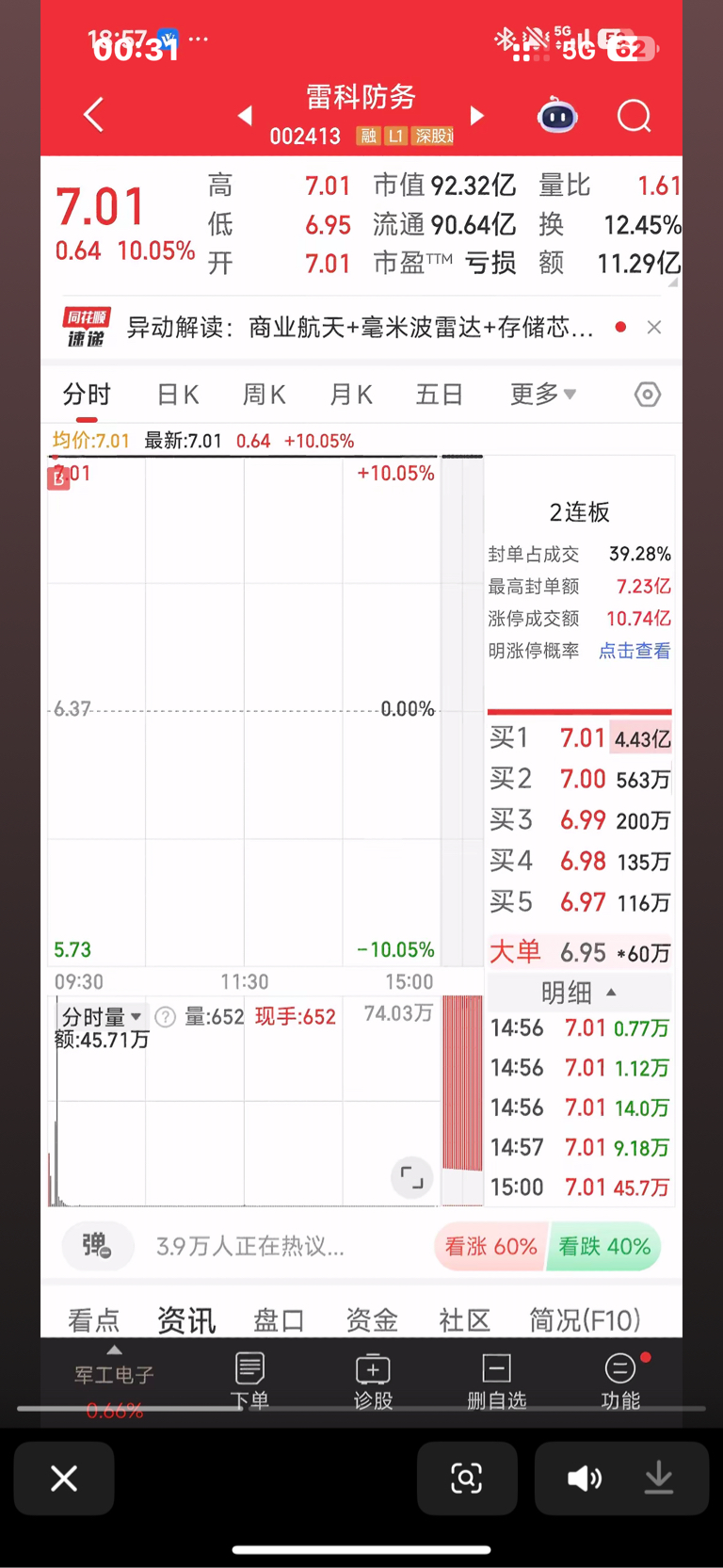 $雷科防务(SZ002413)$ 不贪,明天给一个涨停板,就走