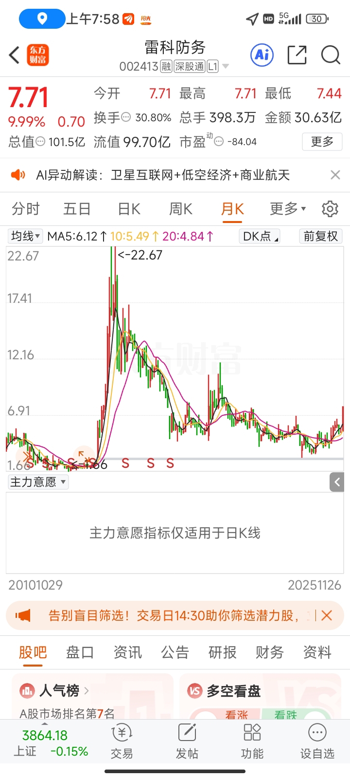 $雷科防务(SZ002413)$ 底部区域股票,横有多宽竖有多高,看看能否突破22块高点,跨年龙必定是雷神