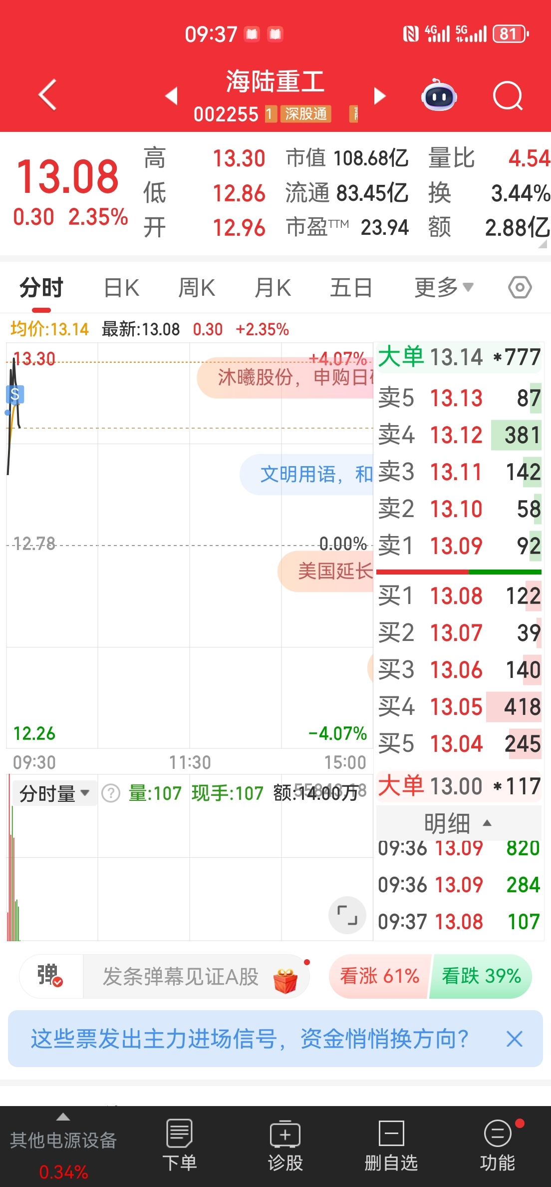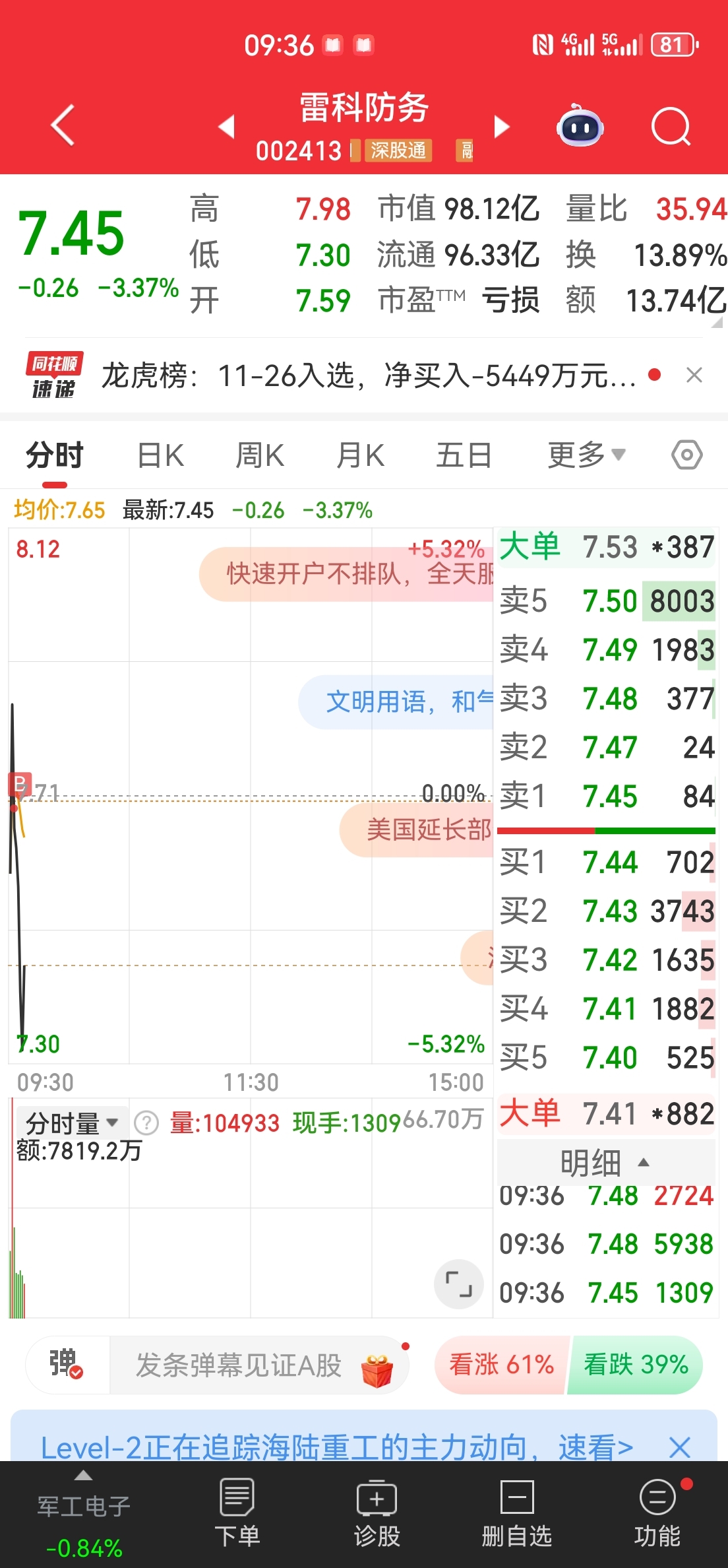 $雷科防务(SZ002413)$ 一万到一百万第28天,海陆开盘+2走了,0轴买了雷科防务