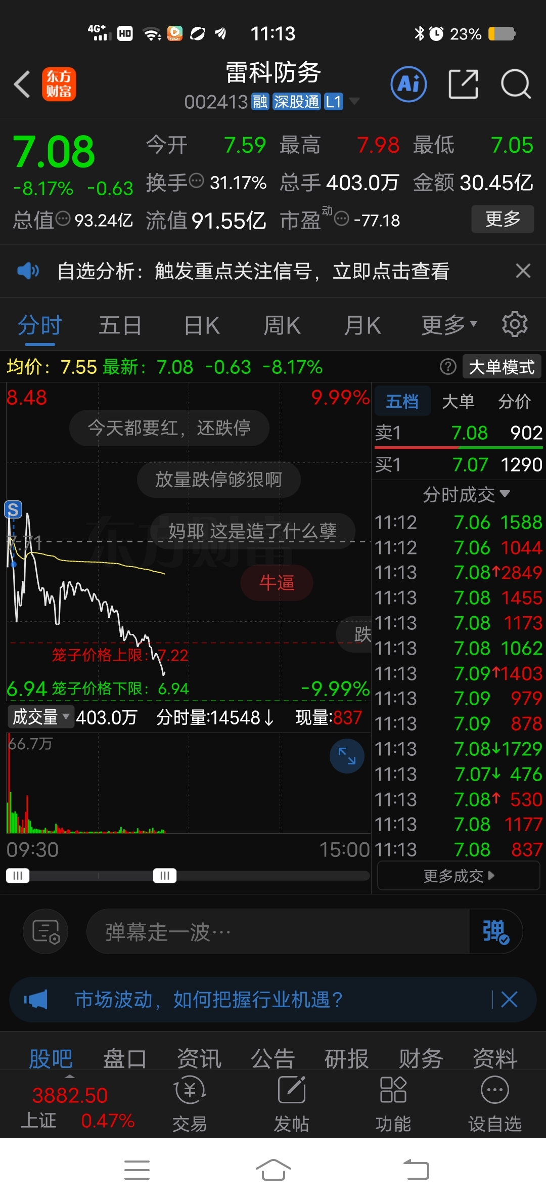 $雷科防务(SZ002413)$ 跌破开盘价就走意象是不行的。那啥实达回吐一个板。没来得及卖,直接7个点开盘看看是不是会反包,跟跳楼机一样。来不及割。行情恶劣。年底少玩啊门这个月拿着22个点清仓注意得了。