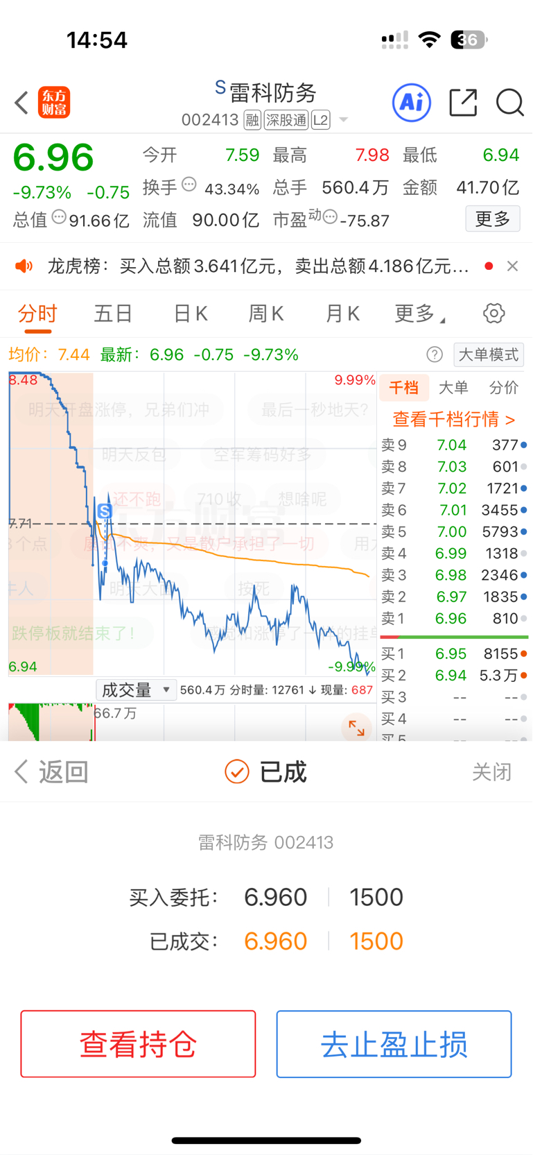 $雷科防务(SZ002413)$ 周四尾盘买的