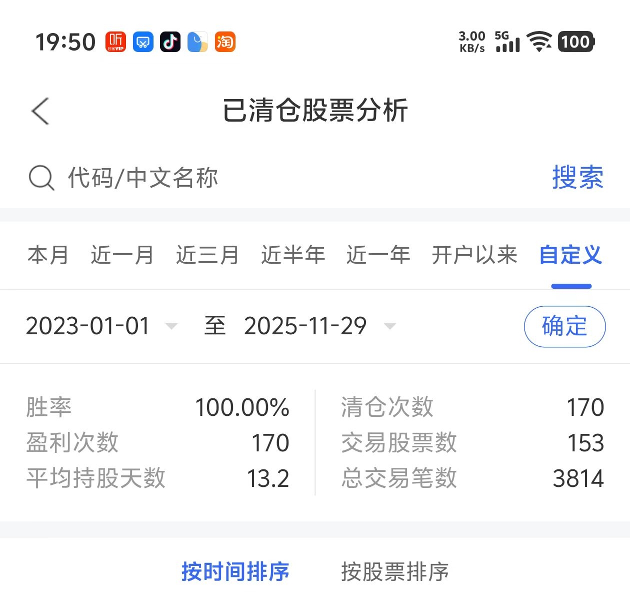 $雷科防务(SZ002413)$ 23年开始,到今天截止,一共153只票,100%胜率