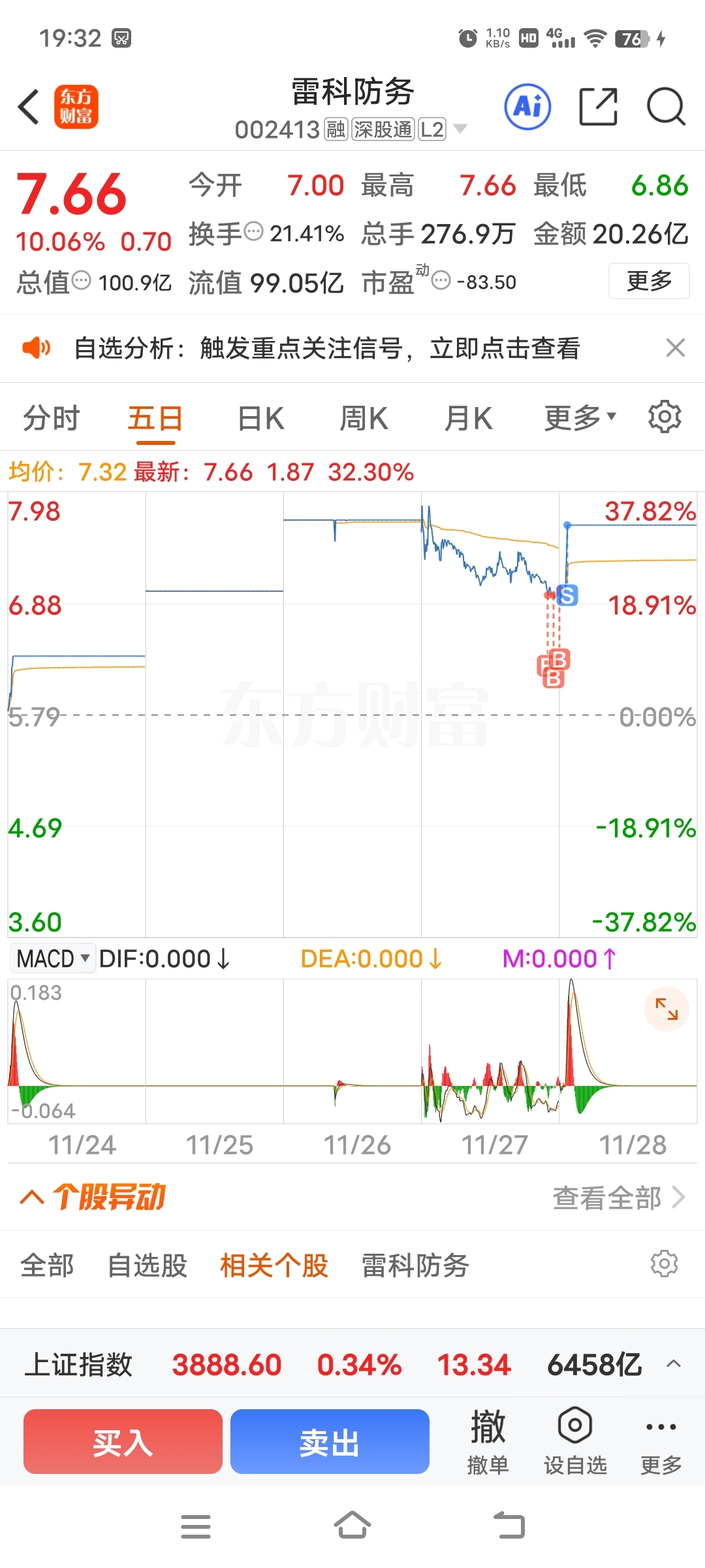 $雷科防务(SZ002413)$ 卖了半仓雷科,买进航天!当天吃到二十个点,感觉亏了呀!