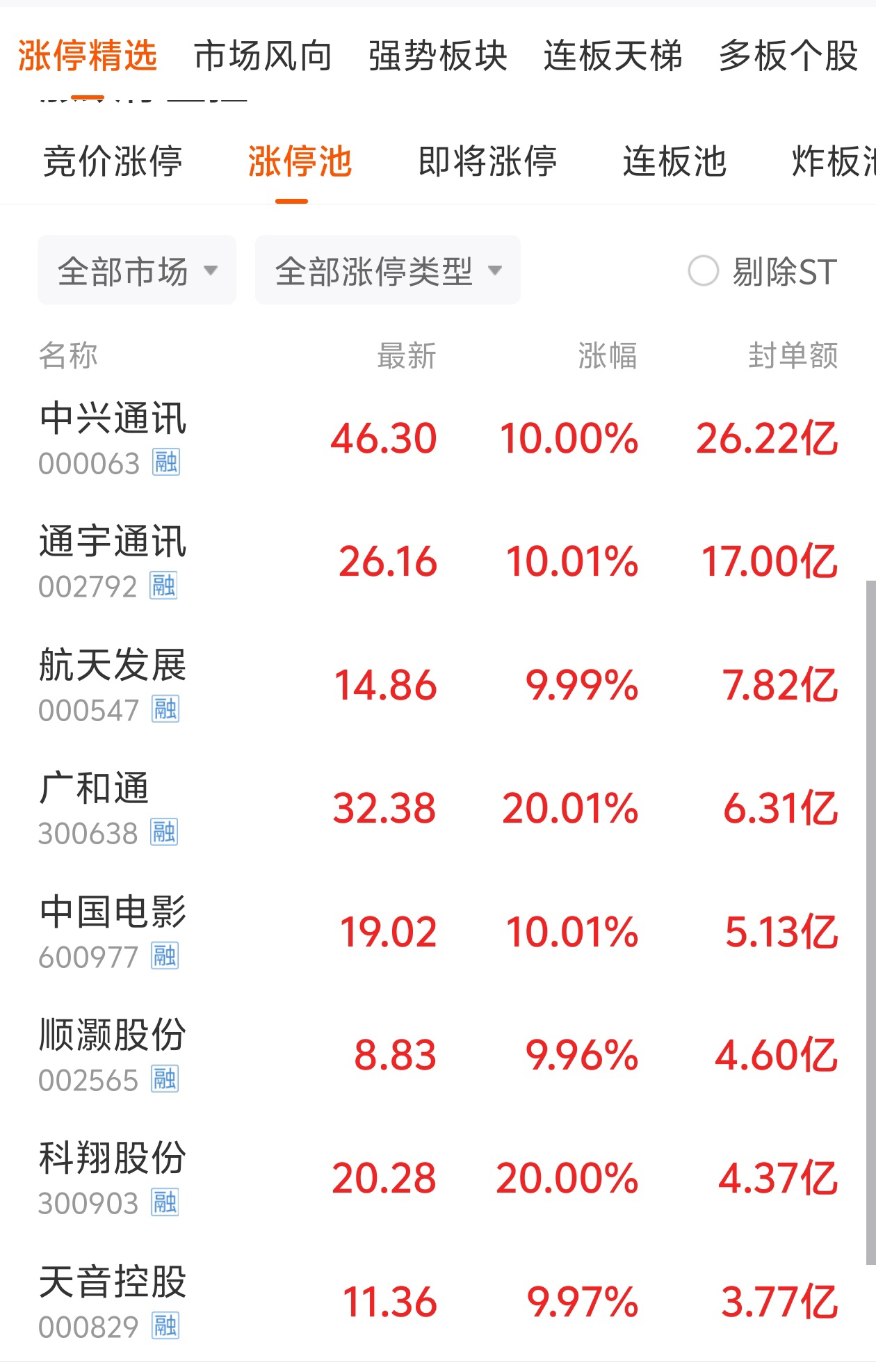这个涨停池有点东西啊!中兴通讯封单32.82亿直接顶死涨停,广和通、科翔股份20cm涨停也够劲爆,通宇通讯、中国电影这些也都是稳稳封板的节奏~通讯+科技线今天是集体发力了?
