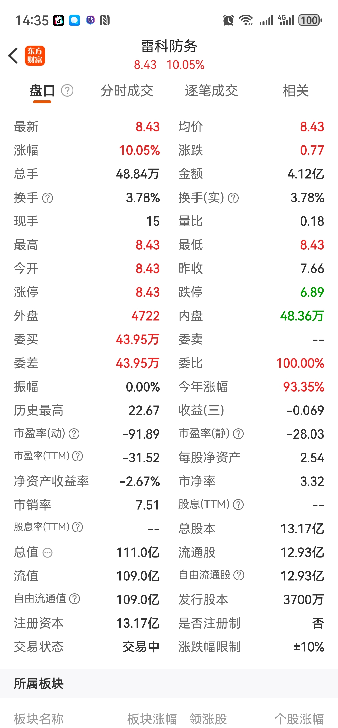 $雷科防务(SZ002413)$ 内盘48万,外盘4700这有点离谱啊……