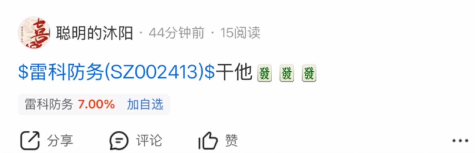 $雷科防务(SZ002413)$ 今早也算是吃上小肉了,认知这一块除了我谁都不服