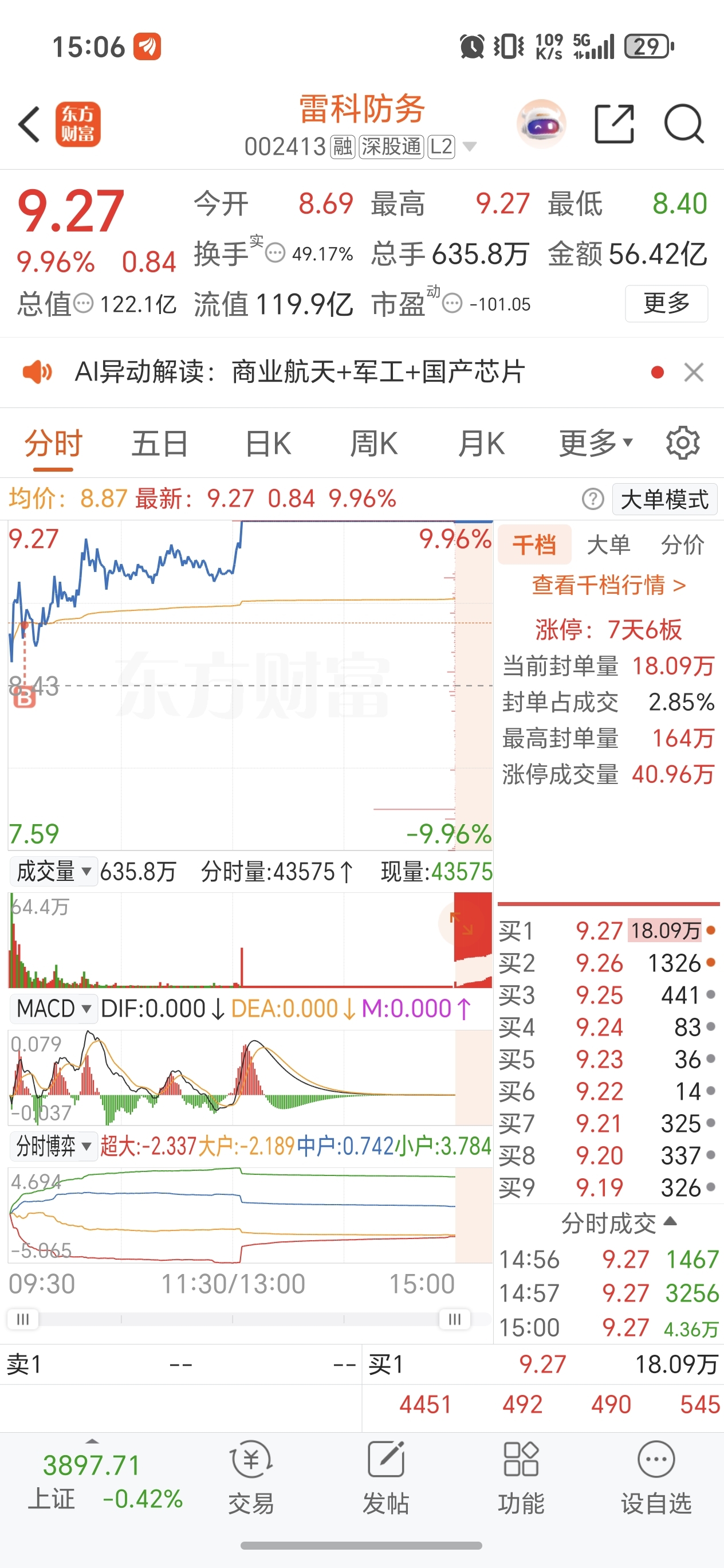 怕撤底卖飞就均线进了航发一半仓位的雷科,然后看见几个前排都板了,雷科一直板不上去就不敢把属于航发的仓位都打进来了,怕被淘汰。哎!哎!哎!