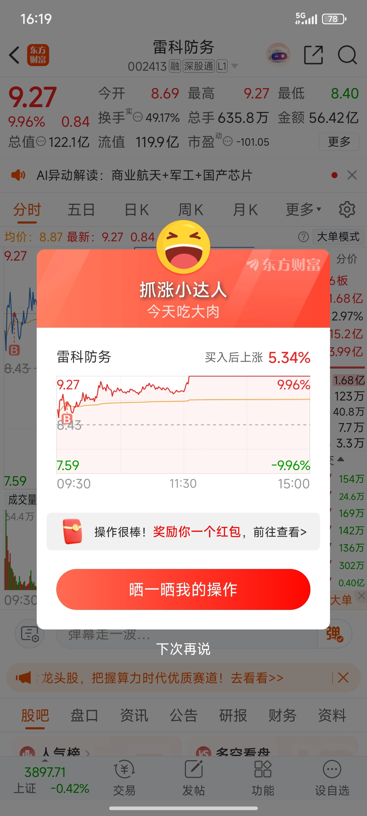 今天我非常的嘚瑟,对今天的操作非常满意,涨停板卖海王,低位接雷科又吃一个涨停。