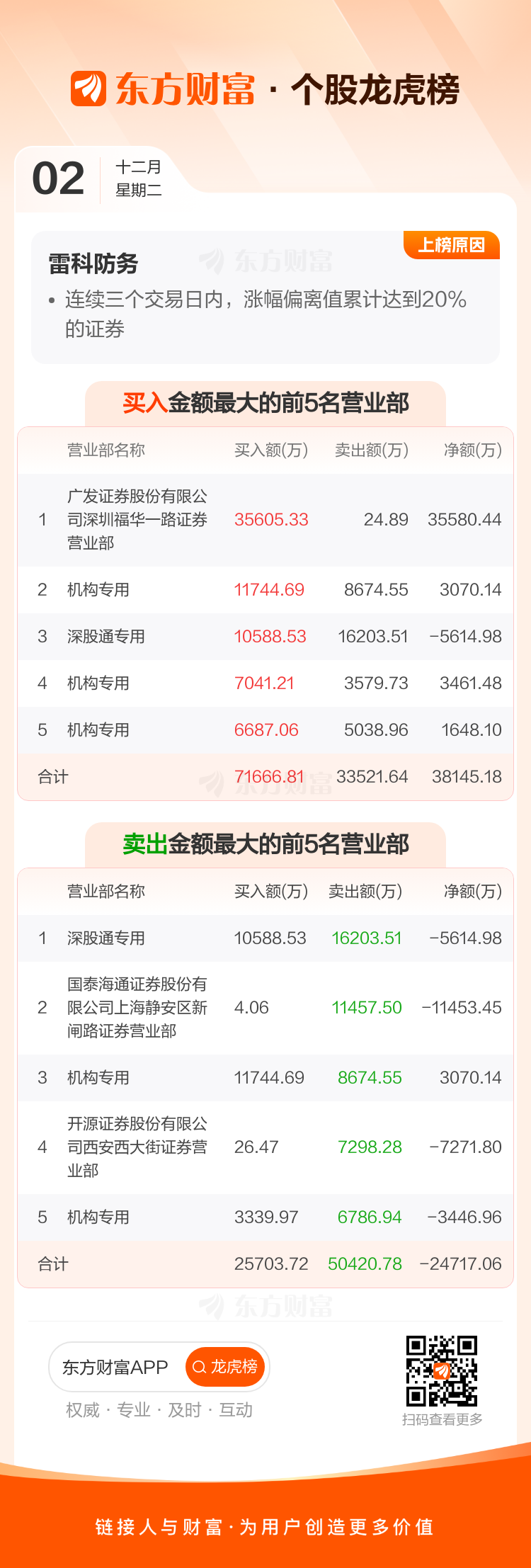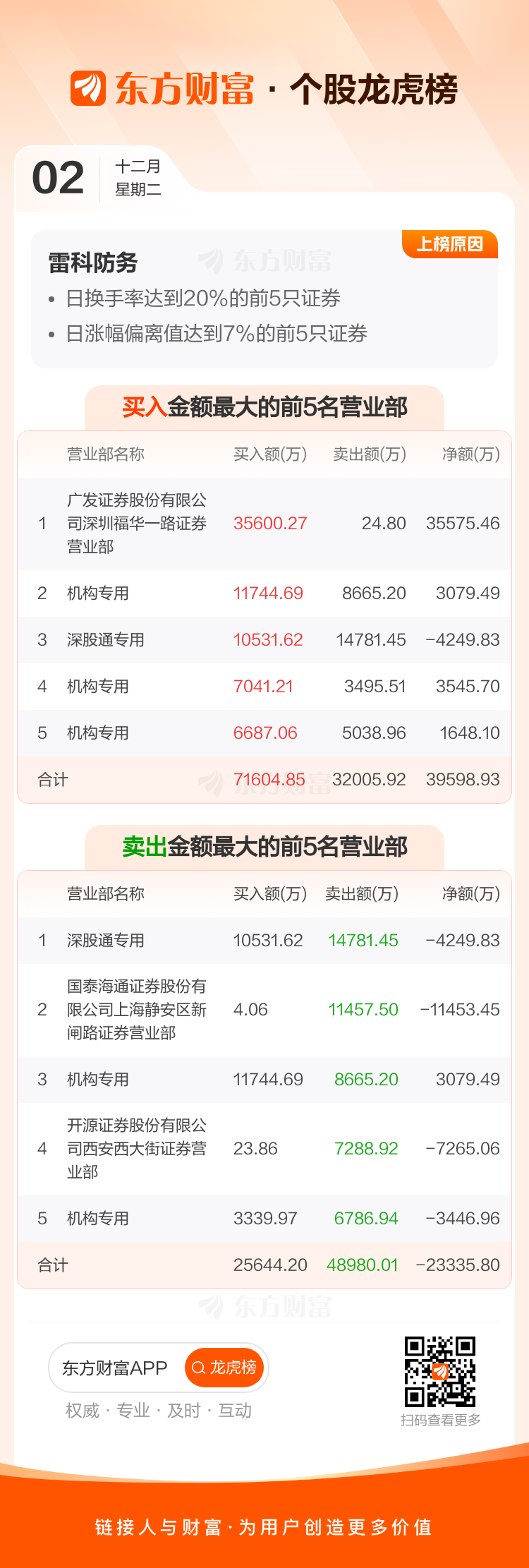交易所2025年12月2日公布的交易公开信息显示,雷科防务因成为日换手率达到20%的前5只证券、日涨幅偏离值达到7%的前5只证券、连续三个交易日内,涨幅偏离值累计达到20%的证券上榜。雷科防务当日收报9.27元,涨跌幅9.96%,偏离值49.17%,换手率49.17%,成交额56.42亿。异常期间12月1日至12月2日,期间涨幅21.02%,累计偏离值20.67%,区间成交额60.61亿。