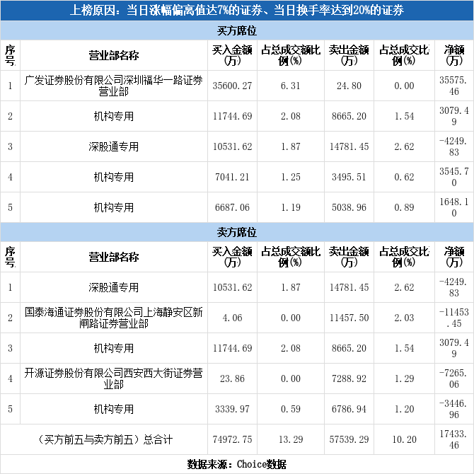 今日龙虎榜单上出现了深股通的身影,占据了买三、卖一的位置,净卖出4249.83万元,占当日成交总额的0.75%。