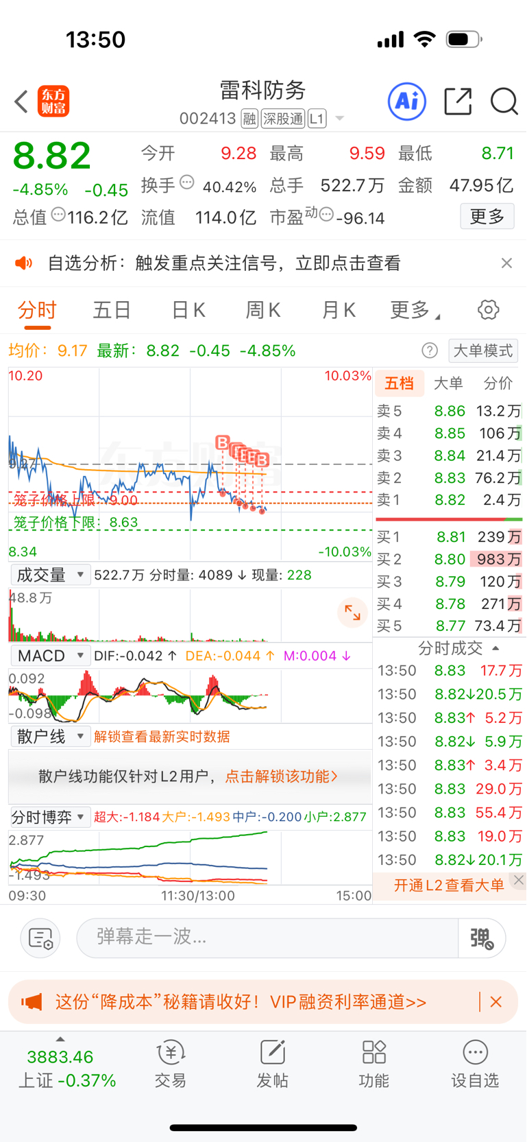 $雷科防务(SZ002413)$ 一直补到你不跌为止