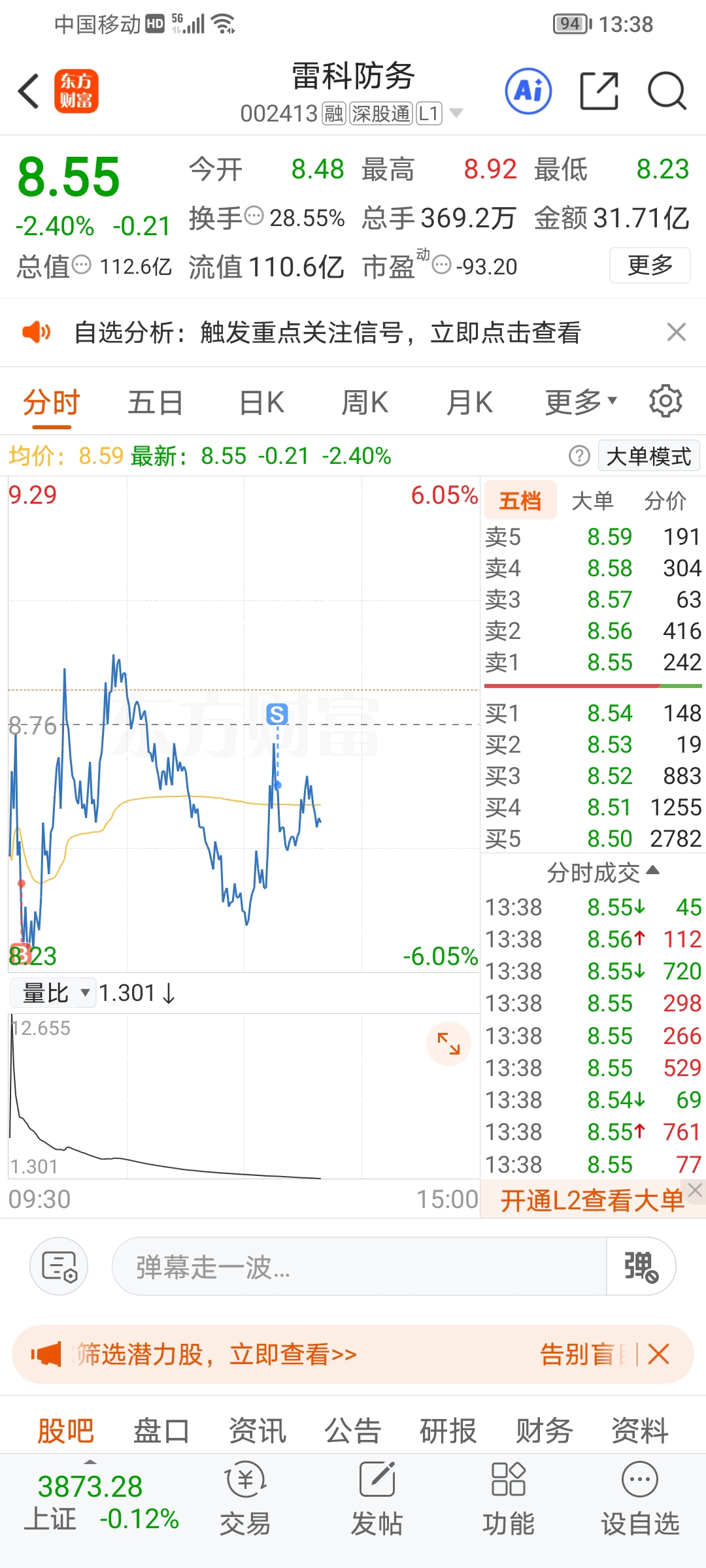 $雷科防务(SZ002413)$ 今天估计就这样了,没有惊喜也没有惊吓了!