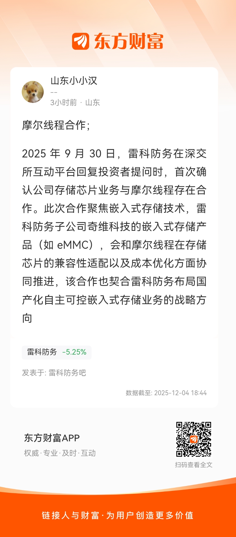 2025 年 9 月 30 日,雷科防务在深交所互动平台回复投资者提问时,首次确认公司存储芯片业务与摩尔线程存在合作。此次合作聚焦嵌入式存储技术,雷科防务子公司奇维科技的嵌入式存储产品(如 eMMC),会和摩尔线程在存储芯片的兼容性适配以及成本优化方面协同推进,该合作也契合雷科防务布局国产化自主可控嵌入式存储业务的战略方向