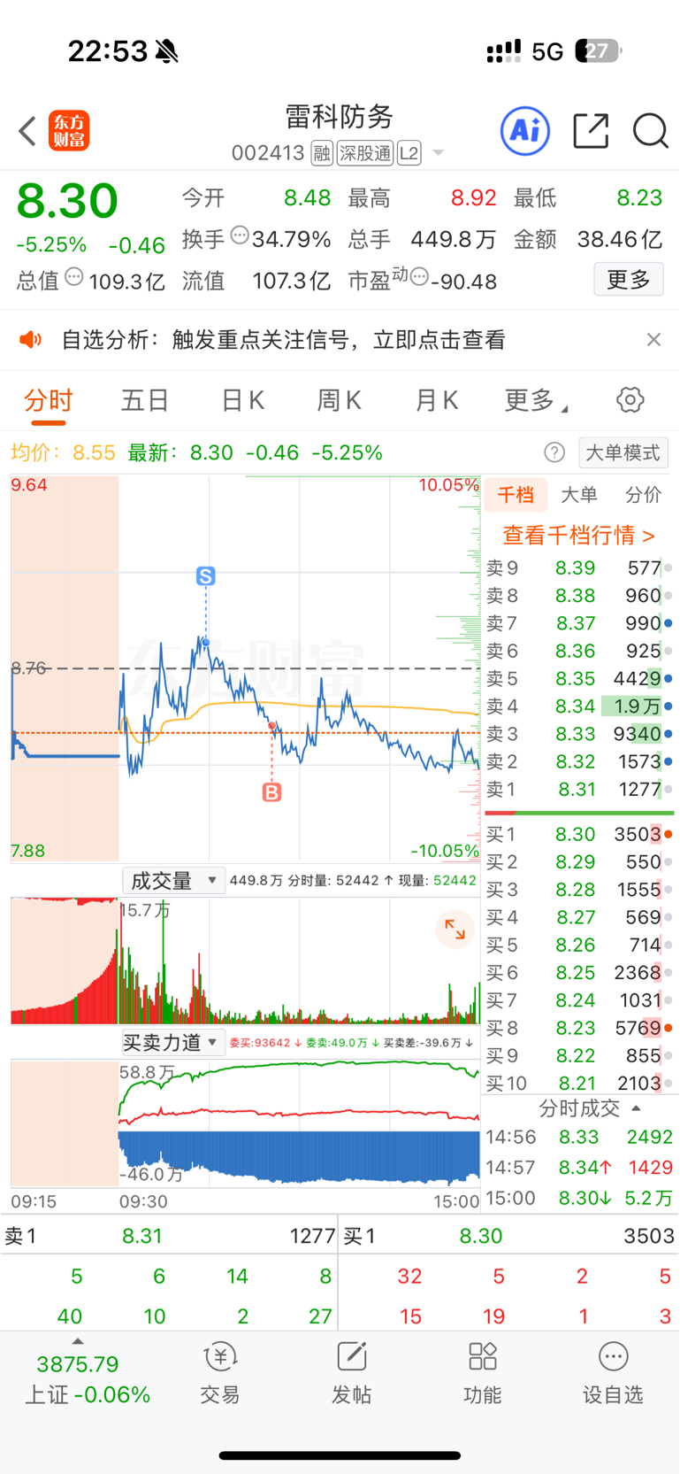 $航天发展(SZ000547)$ 今天航天板块仍有大资金进入,证明航天仍被市场所看好。发展今天虽今天上板三次,群总仍在格局,尾盘的上板后没能强势封住,实在有点可惜。短期来看分歧较大了,只能跟随市场,永远不要预测市场行情,被情绪左右。红尘炼心,股市亦炼心。
