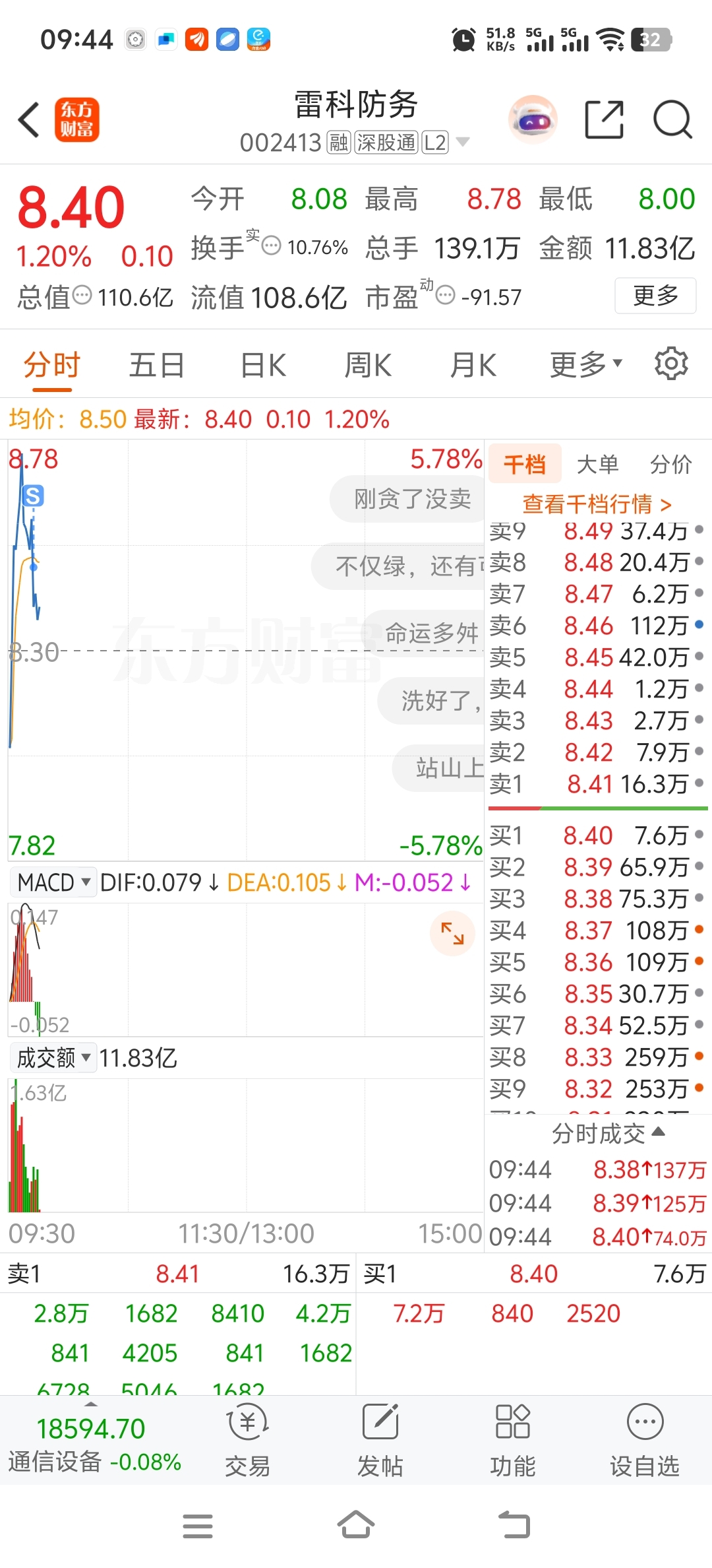 $雷科防务(SZ002413)$ 卖了,挣不到你的钱,跌穿成本价卖了。还好没亏本,再见